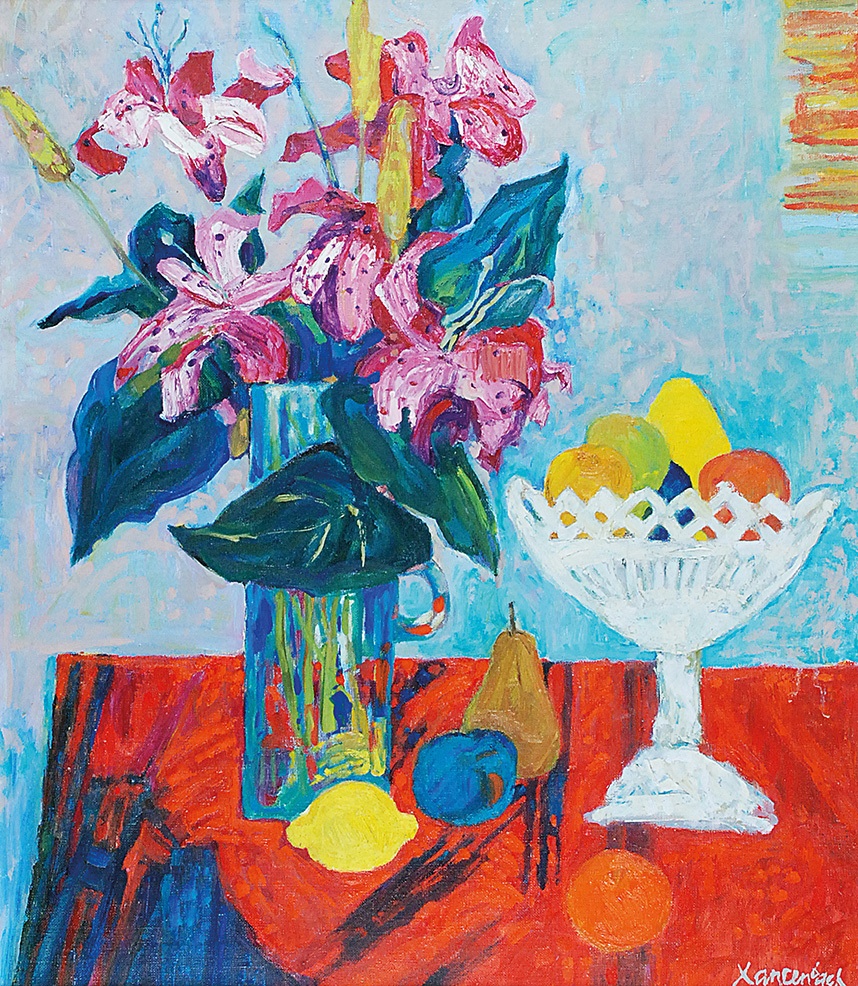 olej, płótno; 77 x 66 cm;sygn. p. d.: JSzancenbach;na odwrocie opis autorski: JAN SZANCENBACH / KWIATY / 1996