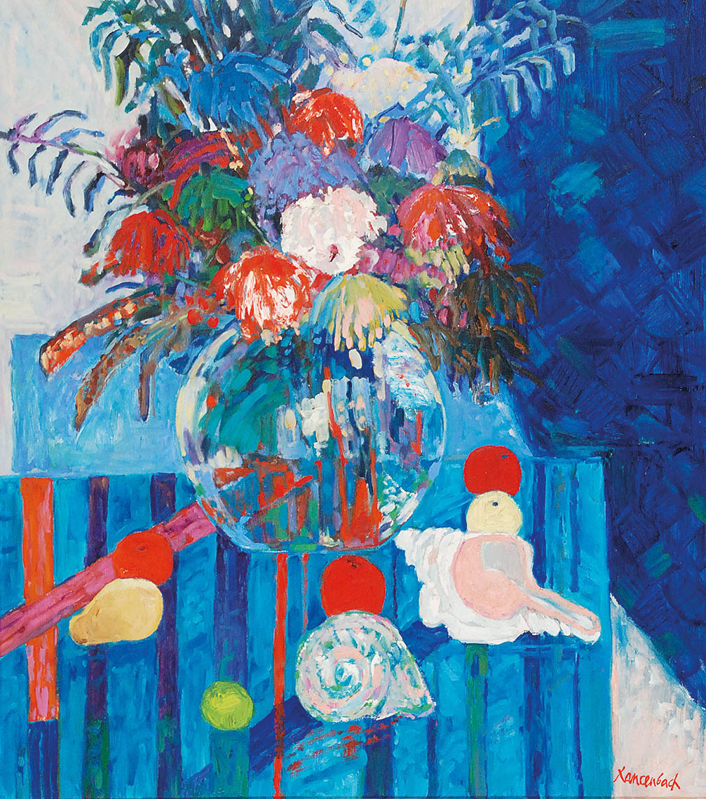 olej, płótno; 95 x 85 cm;sygn. p. d.: Szancenbach;na odwrocie opis autorski: JAN SZANCENBACH / KWIATY I MUSZLE / 1997 oraz nalepkaautorska (?) z informacją o artyście.