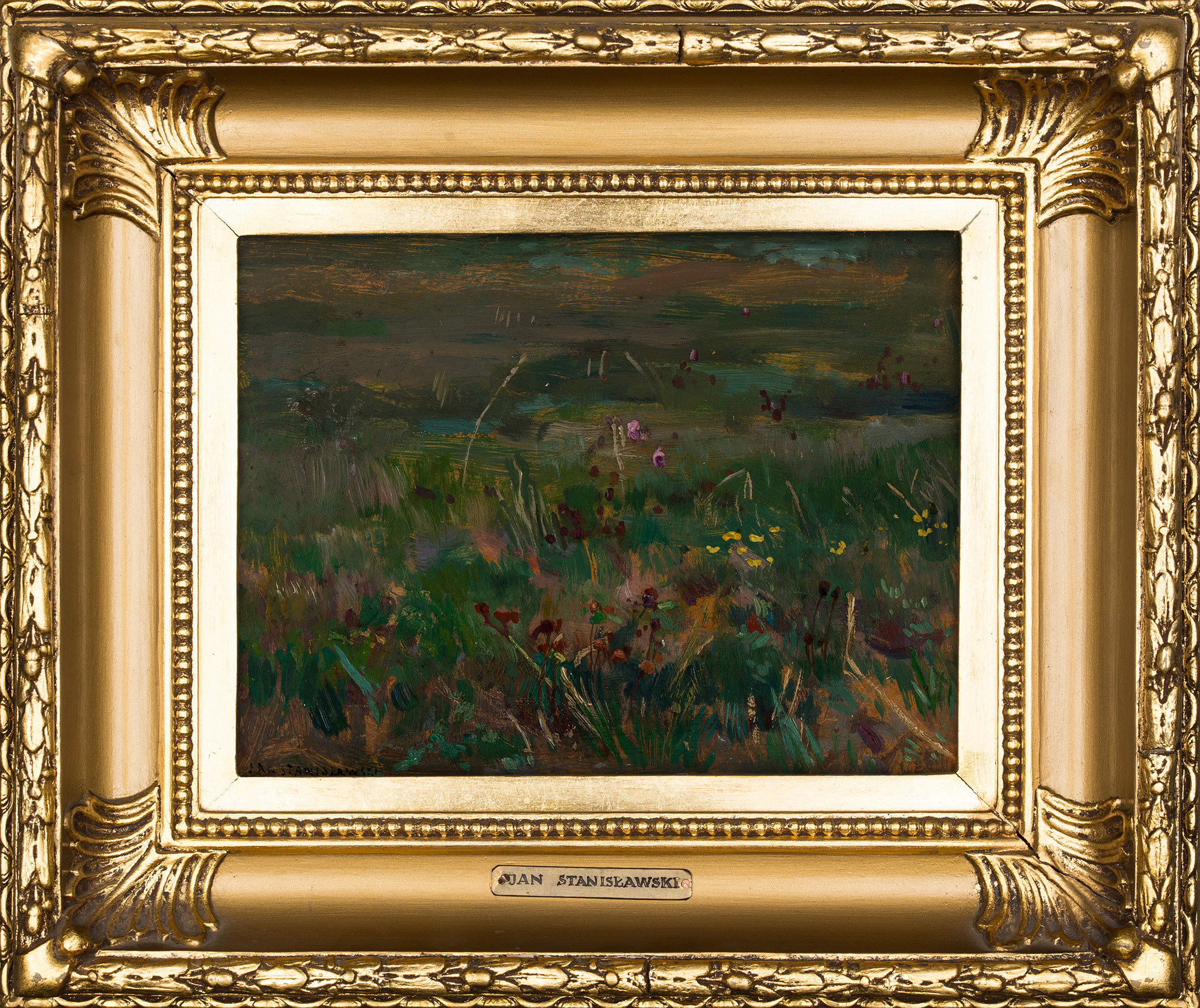 olej na tekturze, 16,5 x 22 cm, sygnowany w lewym, dolnym rogu: "JAN STANISŁAWSKI". Na odwrocie pieczęć z podpisem żony artysty: "JAN STANISŁAWSKI | ZE SPUŚCIZNY | POŚMIERTNEJ | Janina Stanisławska"