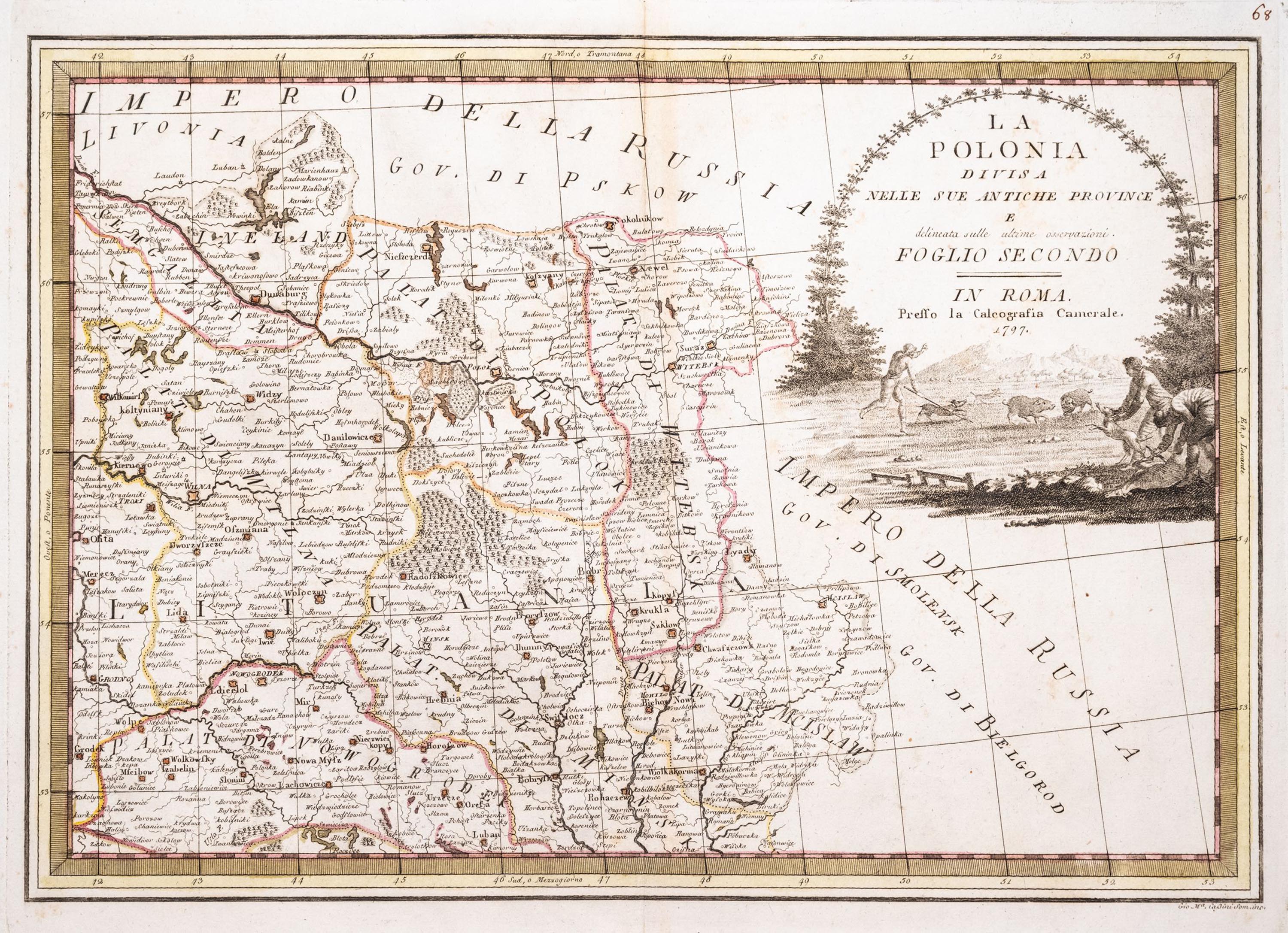 wyd. Calcografia Camerale, Rzym 1797 miedzioryt kolorowany liniowo, wym. map 33,5 x 47-48 cm cztery arkusze; stan zachowania dobry +, niewielkie brązowe plamy, naddarcia marginesu, zagniecenia Imago Poloniae, K68/1