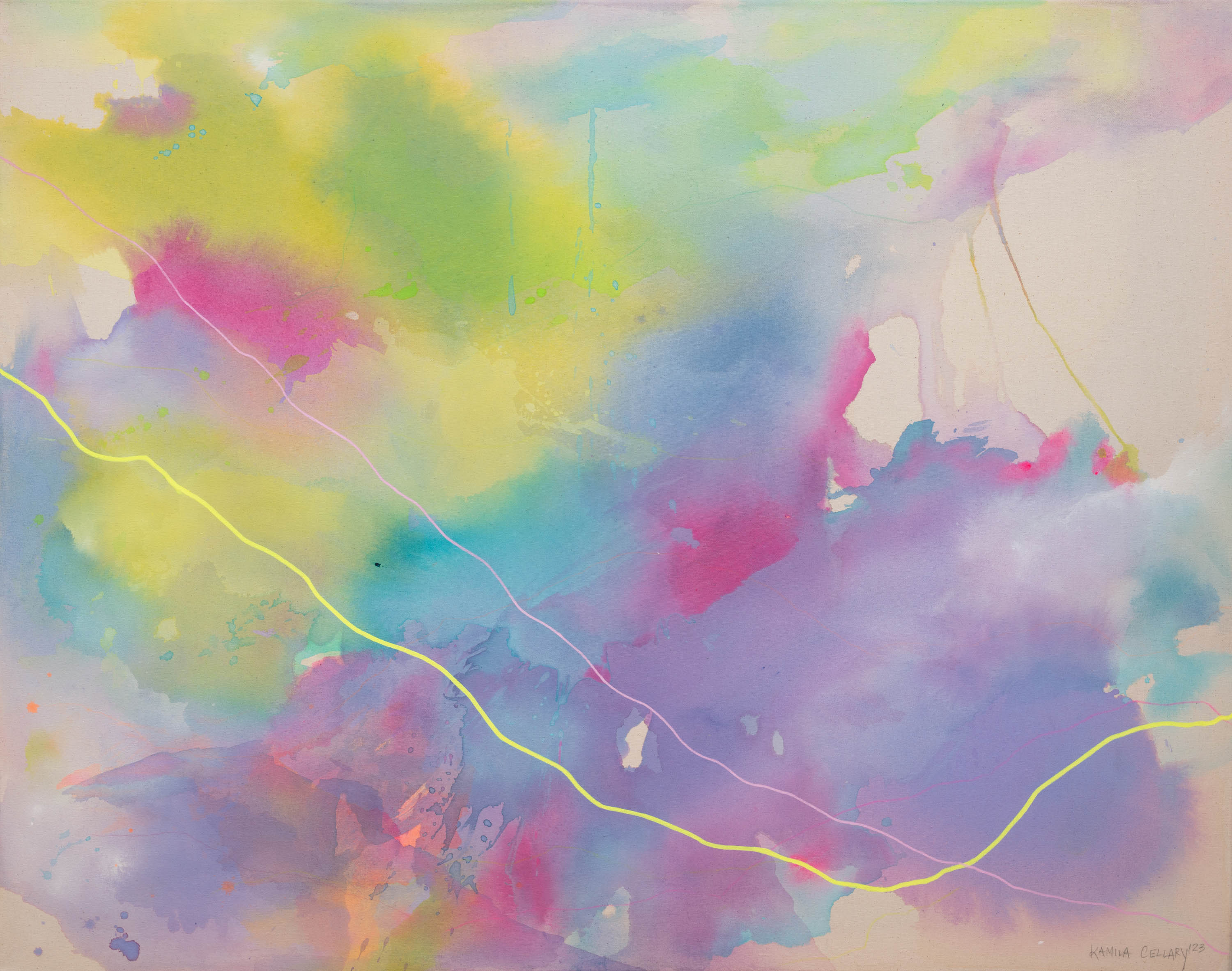 technika mieszana, płótno, 95 x 120 cm,sygnowany p.d.: 'KAMILA CELLARY '23' oraz opisany na odwrocie: '"ŁĄKA W DÓŁ DO BASENU" | WARSZAWA 2023 | Kamila Cellary'