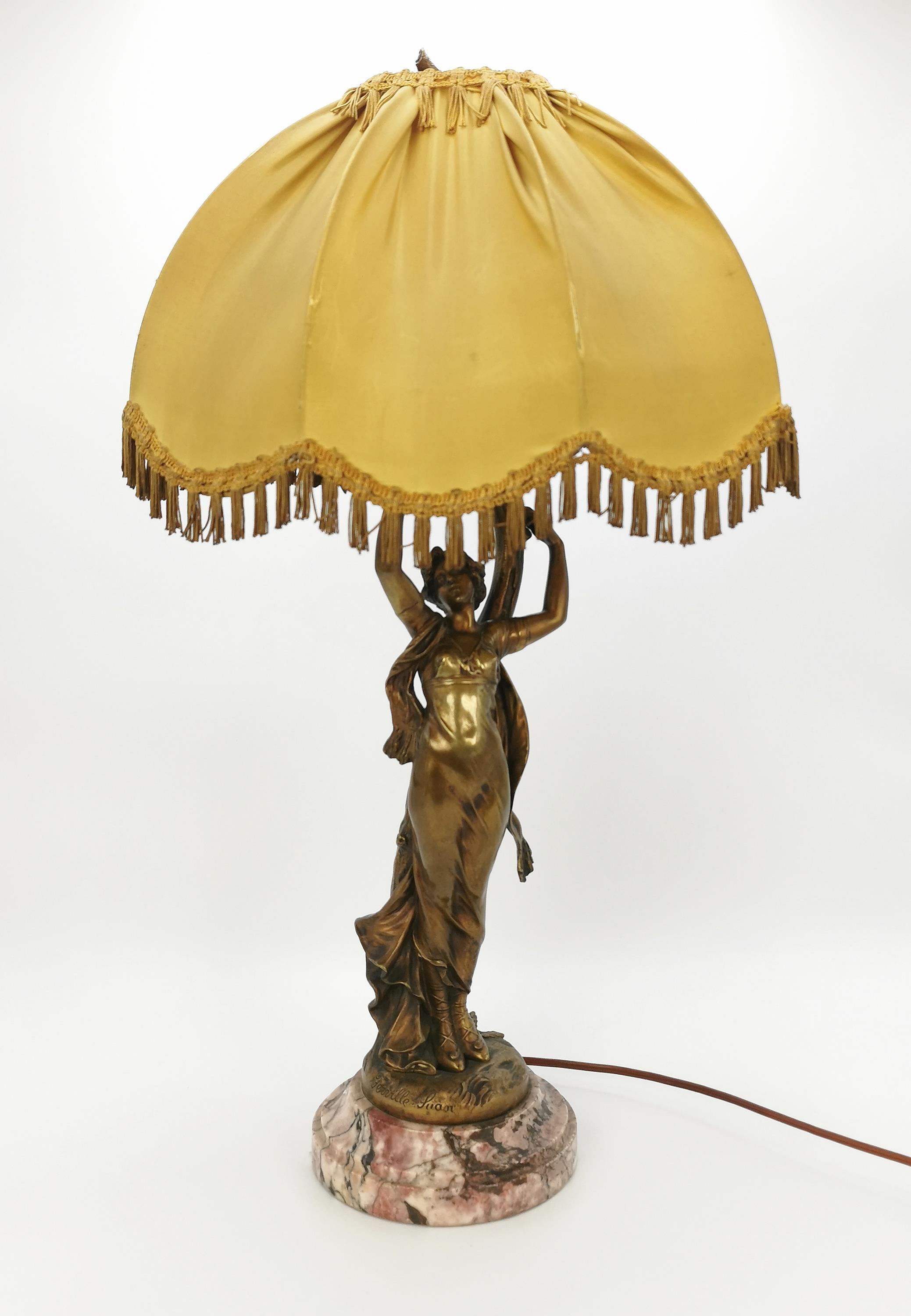 Lampa gabinetowa na kolistej, toczonej podstawie z wielobarwnego marmuru, z trzonem w formie postaci kobiecej w obcisłej sukni i balowych pantofelkach, z szalem na ramionach, podtrzymującej uniesionymi rękami obręcz, na której wspiera się abażur. Sygn. „Ferville Suan”.