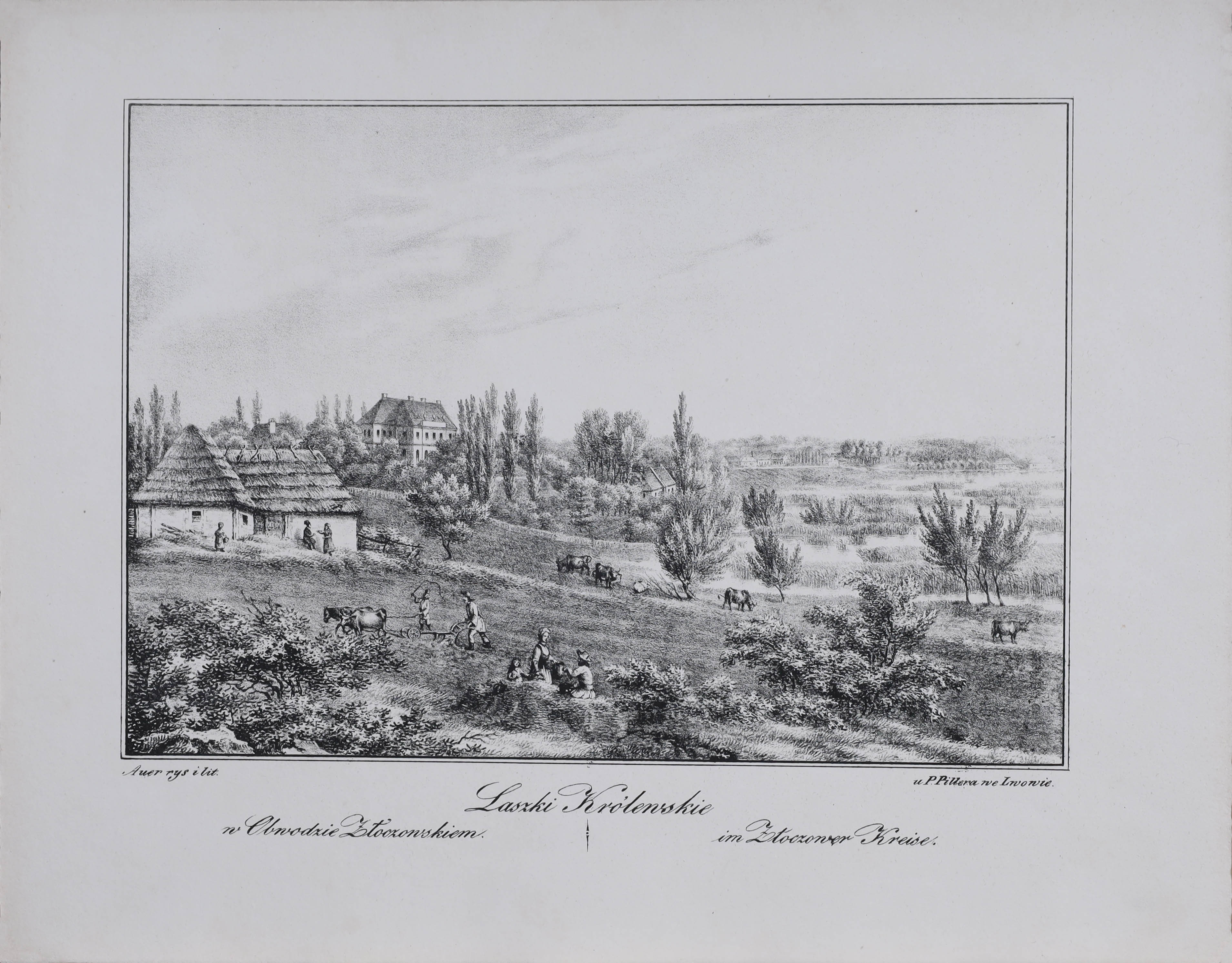 litografia, papier, 24 x 31 cm;opisany u dołu: Auer rys i lit. / Laszki Królewskie w Obwodzie Złoczowskim / im Złoczoner Kreise / u P.Pillera we Lwowie