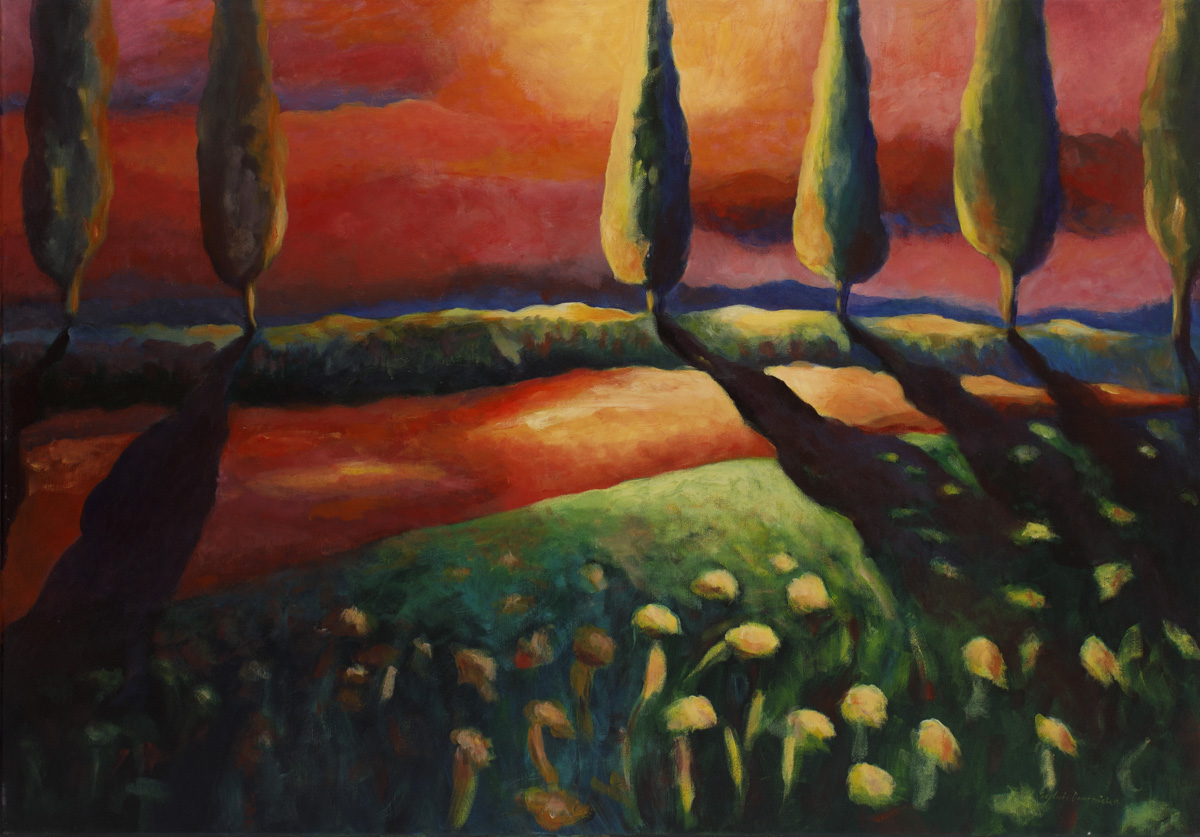 akryl, płótno, 70x100 cm,sygn. p.d.: Sylwia Dwornicka,opisany na odwrocie: "LATO NAD RZEKĄ" Sylwia Dwornicka 2021