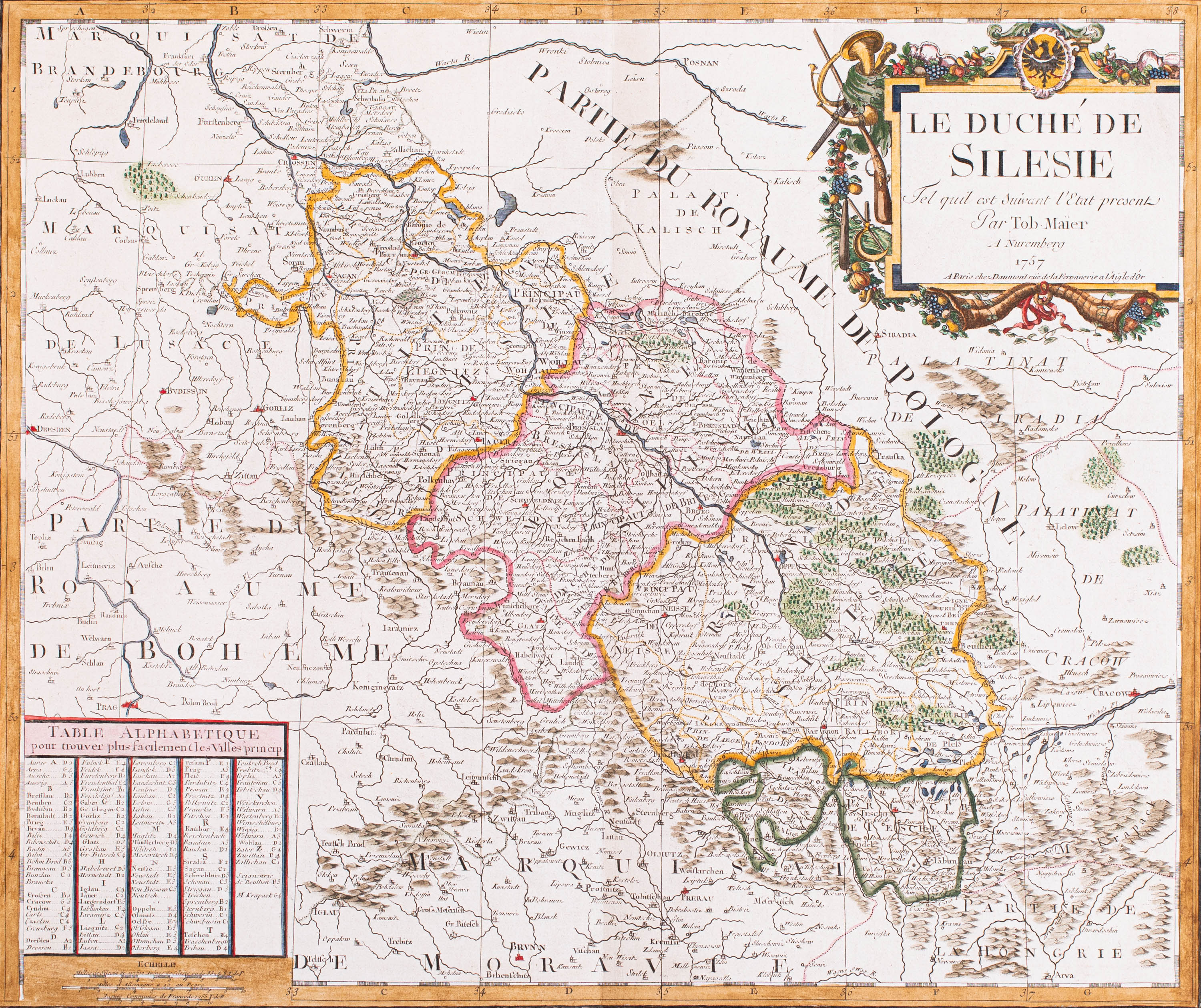 Mapa Księstwa Śląskiego, wyd. Jean-Francois Daumont, Paryż, 1757miedzioryt kolorowany, 50 × 58 cm (odcisk płyty)stan zachowania dobry, po konserwacji, podklejone marginesy