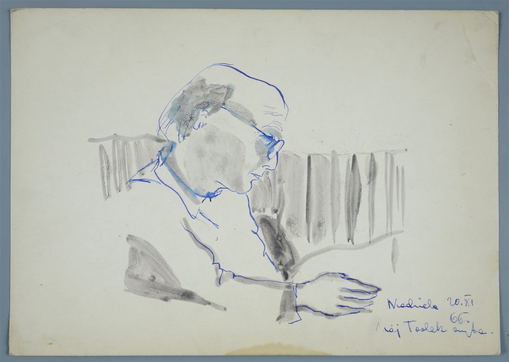 pióro, atrament niebieski, tusz lawowany, karton23 x 32 cmnapis autorski u dołu z prawej: Niedziela 20. XI/ 66. / Mój Tadek czyta (piórem, atramentem).