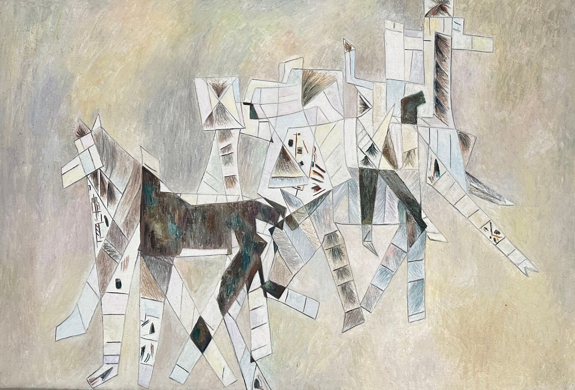 To nie jest współczesna abstrakcja, lecz przykład europejskiego malarstwa z połowy XX wieku, nasycony symboliką i oniryzmem (marzeniem sennym).
