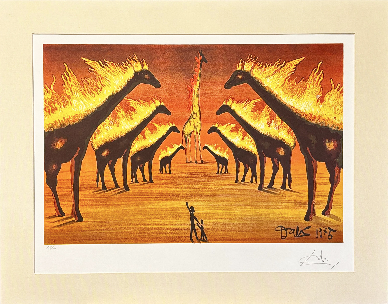 Wersja z 1975 roku, widoczna na Twoim zdjęciu, przedstawia wiele płonących żyraf ustawionych w rzędach, co tworzy perspektywiczną aleję prowadzącą w głąb pomarańczowo-brązowego krajobrazu.