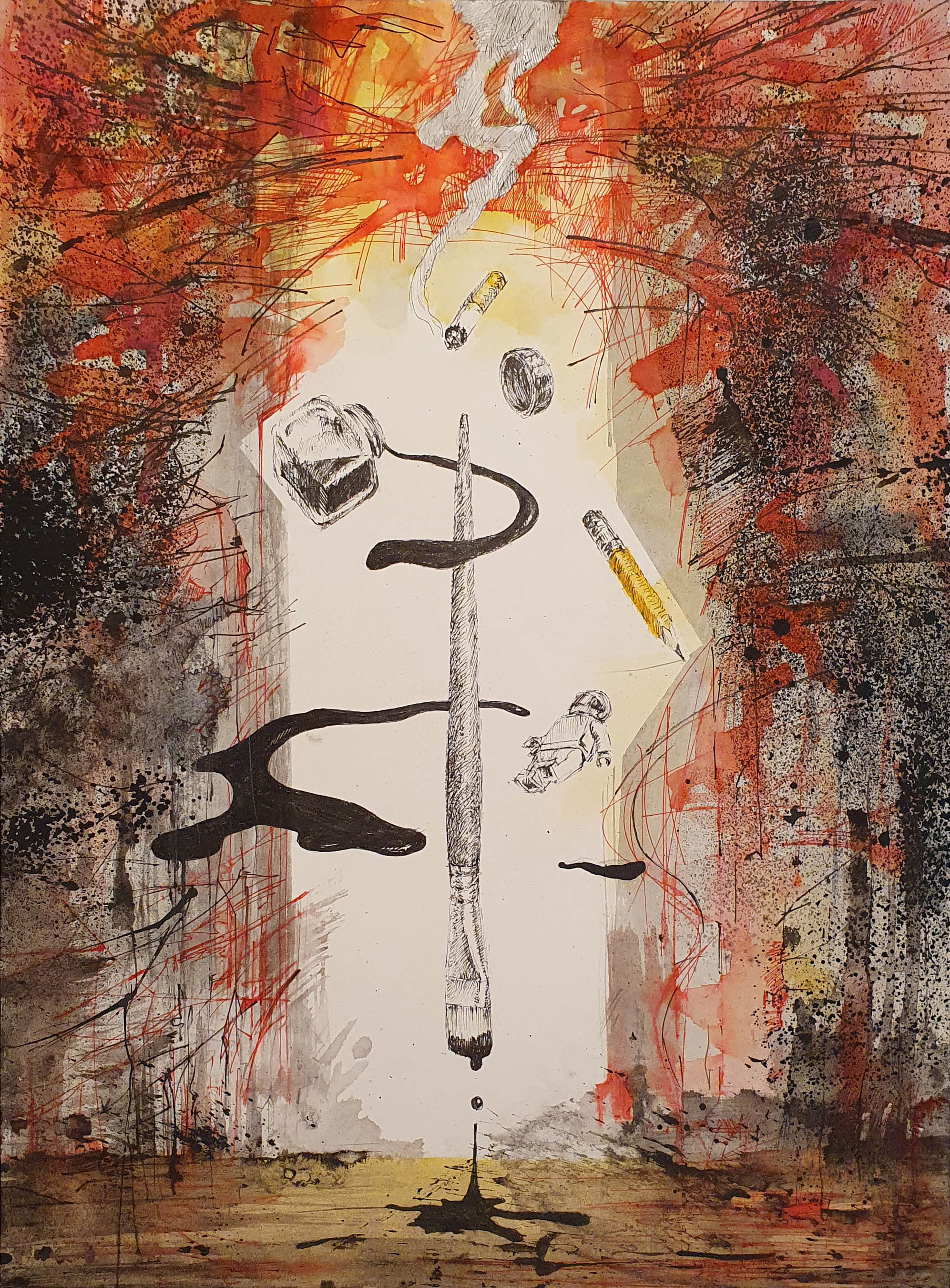 technika mieszana (akwarela, ołówek, cienkopisy, tusz), papier, 46 x 34 cm,