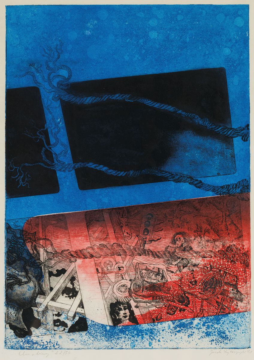 Akwaforta, akwatinta barwna, papier; 57 x 41 cm (w świetle p-p)Sygnowany ołówkiem pod ryciną: ...”Liny” 22/30 Jacek Rybczyński 71