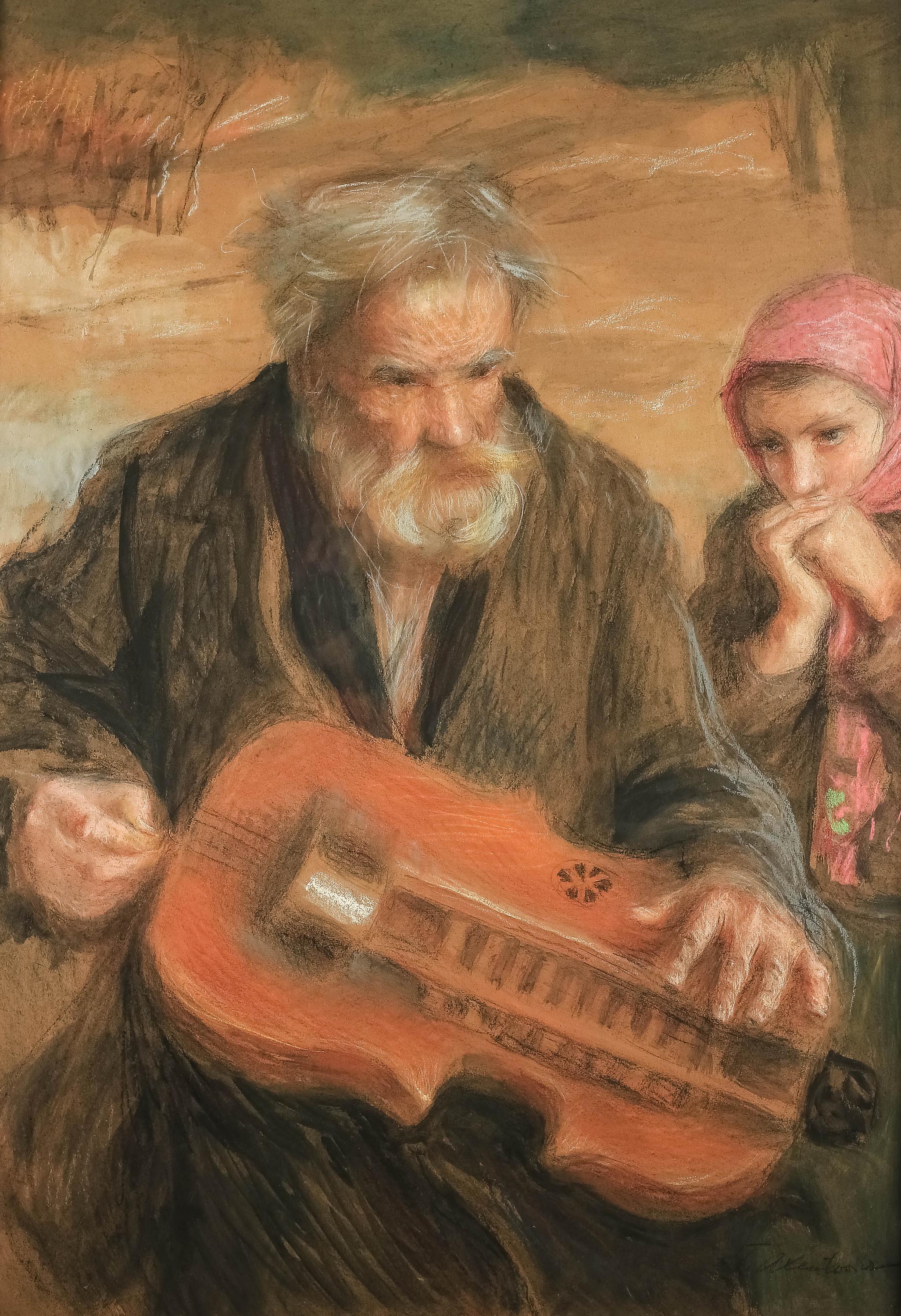 Axentowicz do postaci wędrownego ludowego śpiewaka powracał jeszcze wielokrotnie. Przedstawiał go często jako samotnika wędrującego w zimowej scenerii (znany jest m. in obraz z około 1900 r.: „Lirnik i dziewczyna” (olej, tektura. 60,5 × 49,8 cm; ze zbiorów Lwowskiej Narodowej Galerii Sztuki im. Borysa Woźnickiego), jak i też siedzącego pod drzewem w towarzystwie młodej dziewczyny lub dziecka. Prezentowana na aukcji praca jest właśnie wyjątkowym przykładem ukazania postaci lirnika – niczym natchnionego wieszcza i zasłuchanej z boku młodej dziewczynie, ze złożonymi dłońmi w geście modlitwy. Obraz został wykonany w technice pasteli, w której Axentowicz nie miał sobie równych.