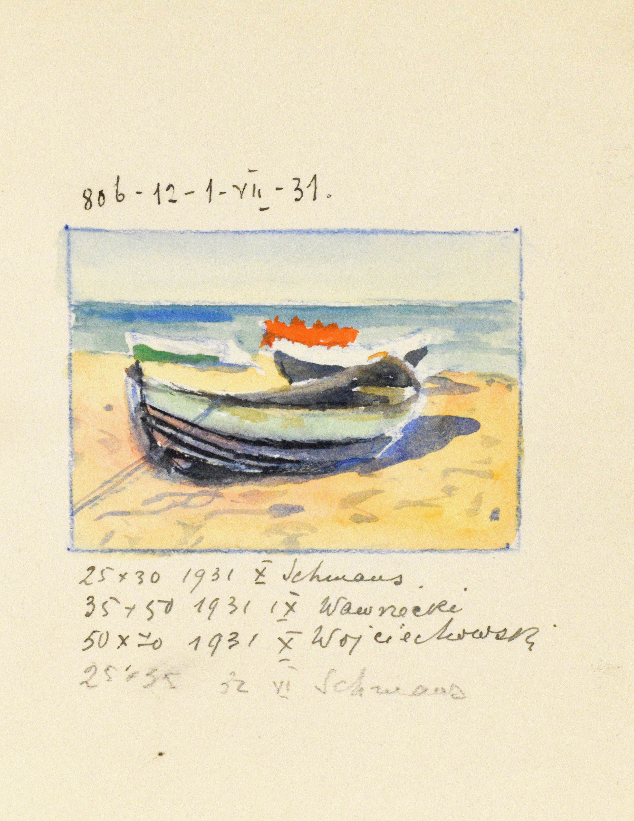 akwarela, gwasz, brystol; 14,1 x 12 cm (wym. arkusza), 5 x 6,9 cm (wym. rysunku); opis. autorsko u góry: 806 - 12 - 1 - VII - 31. oraz na dole: wymiary, daty oraz nabywcy. Na odwrocie rysunek: Brzeg morza, 1931 (5 x 6,8 cm) również opisany autorsko.