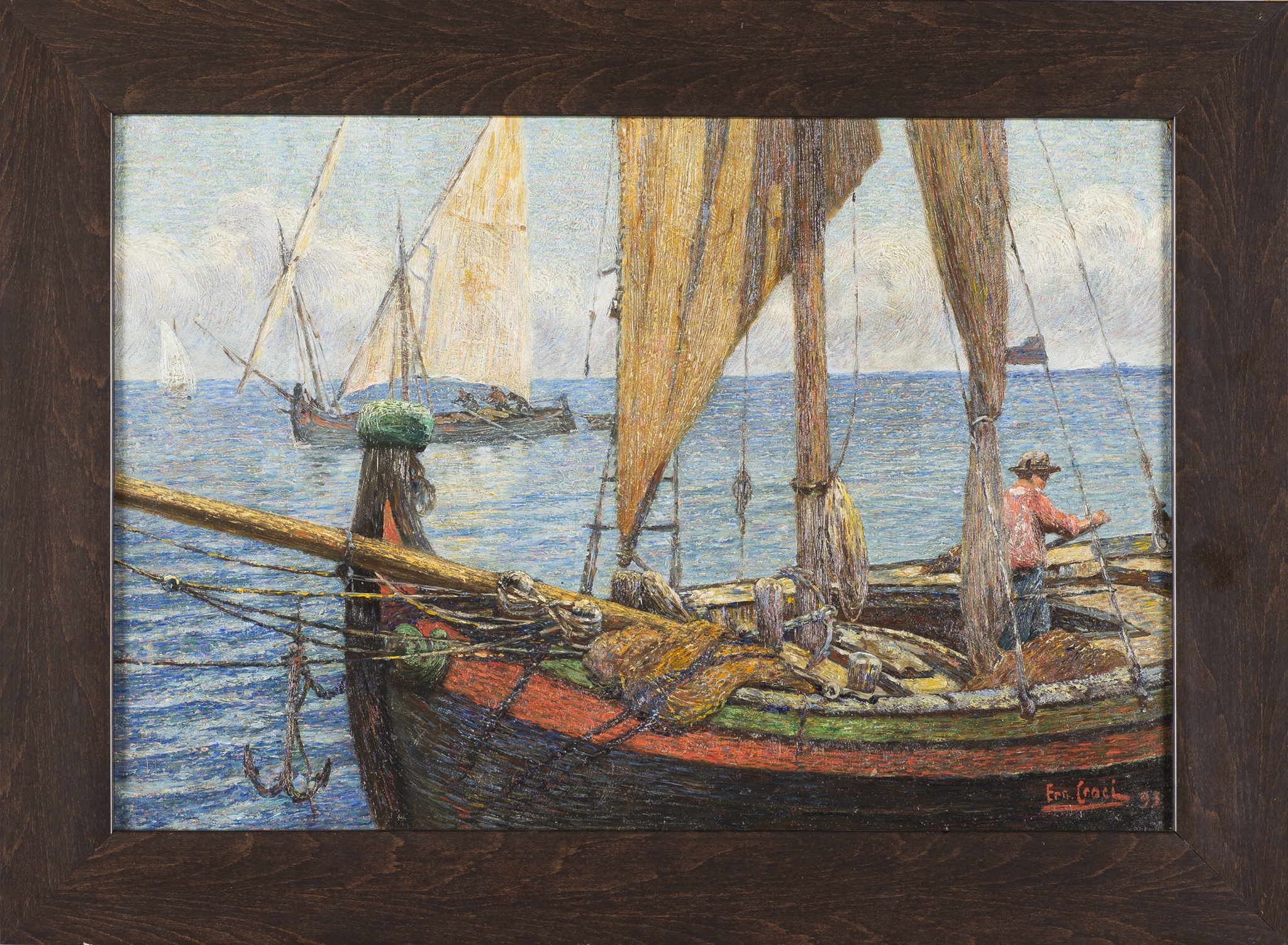 "Łodzie" E. Croci to obraz o kompozycji zbudowanej na mocnym kontraście linii pionowych i poziomych. Bliski pierwszy plan stanowi fragment kutra rybackiego, którego maszty i dziób dzielą pionowo przestrzeń obrazu. Poziomym akcentem jest linia horyzontu Adriatyku. Artysta odważnie zestawia mocne barwy, maluje fakturowo, zostawia widoczne ślady pędzla.