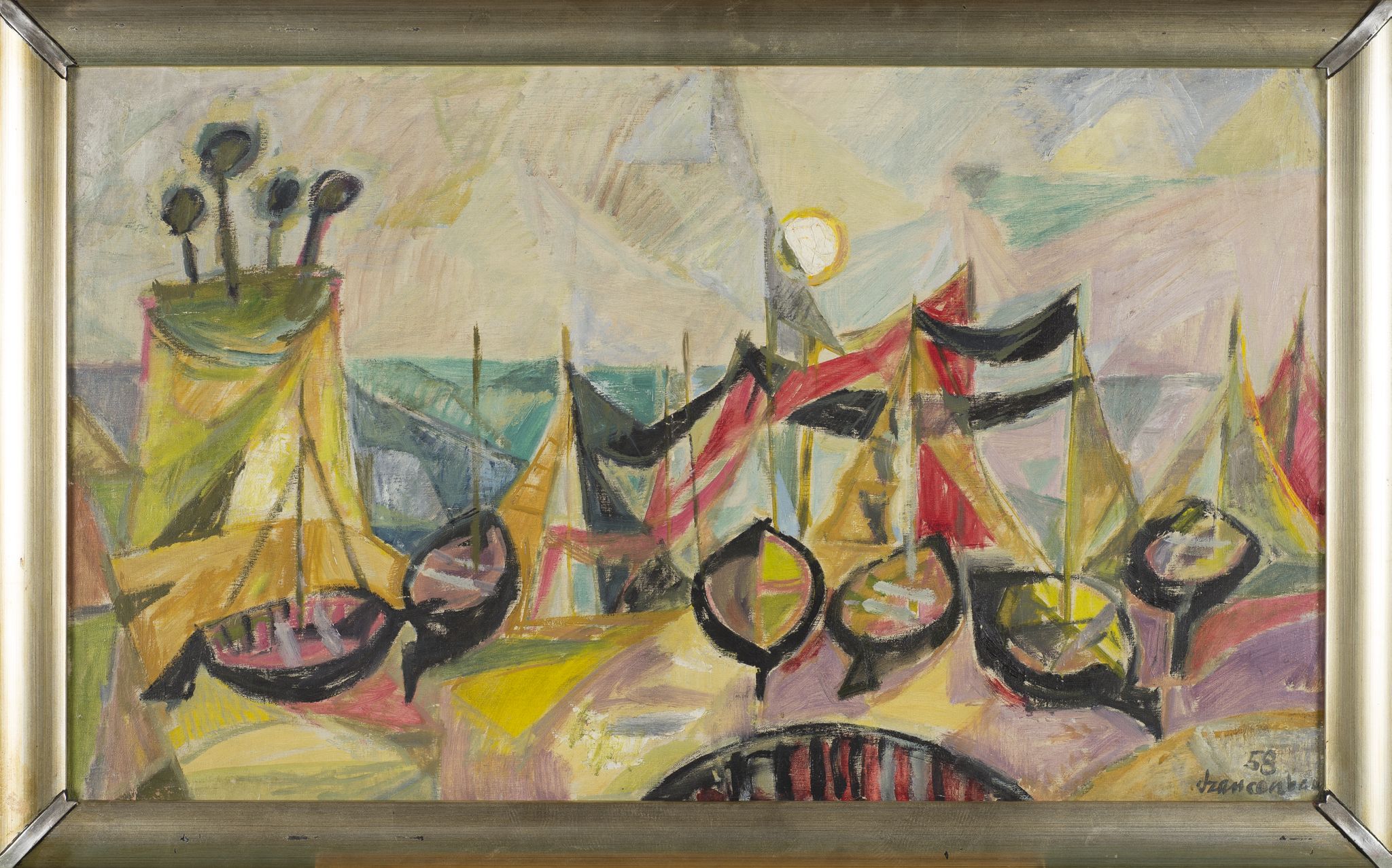 sygn. p.d.: 58 Szancenbach, opis autorski na odwrocie: Łodzie na Brzegu, mal Jan Szancenbach 1958.