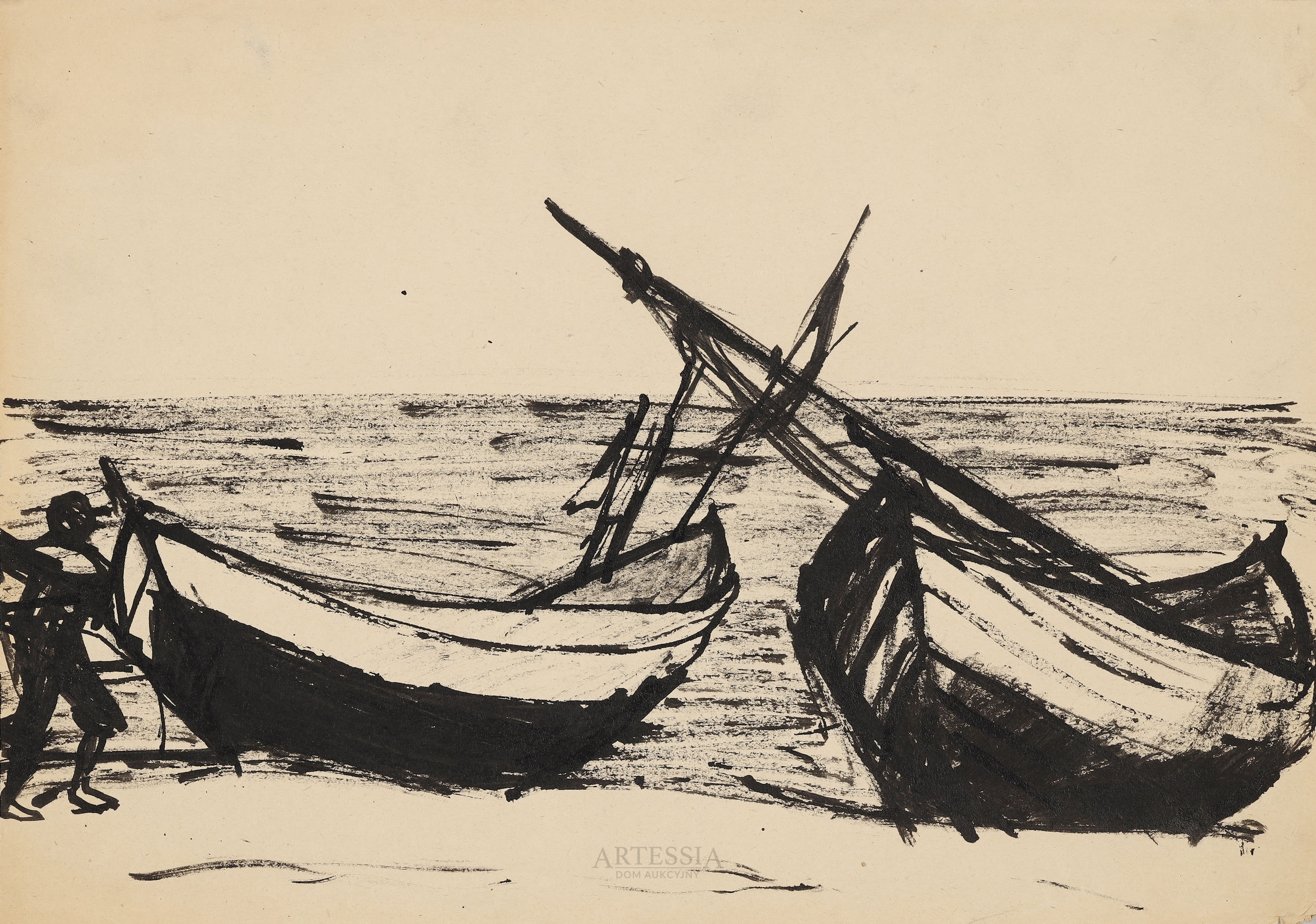 Łodzie rybackie na plaży, lata 50-te XX w.