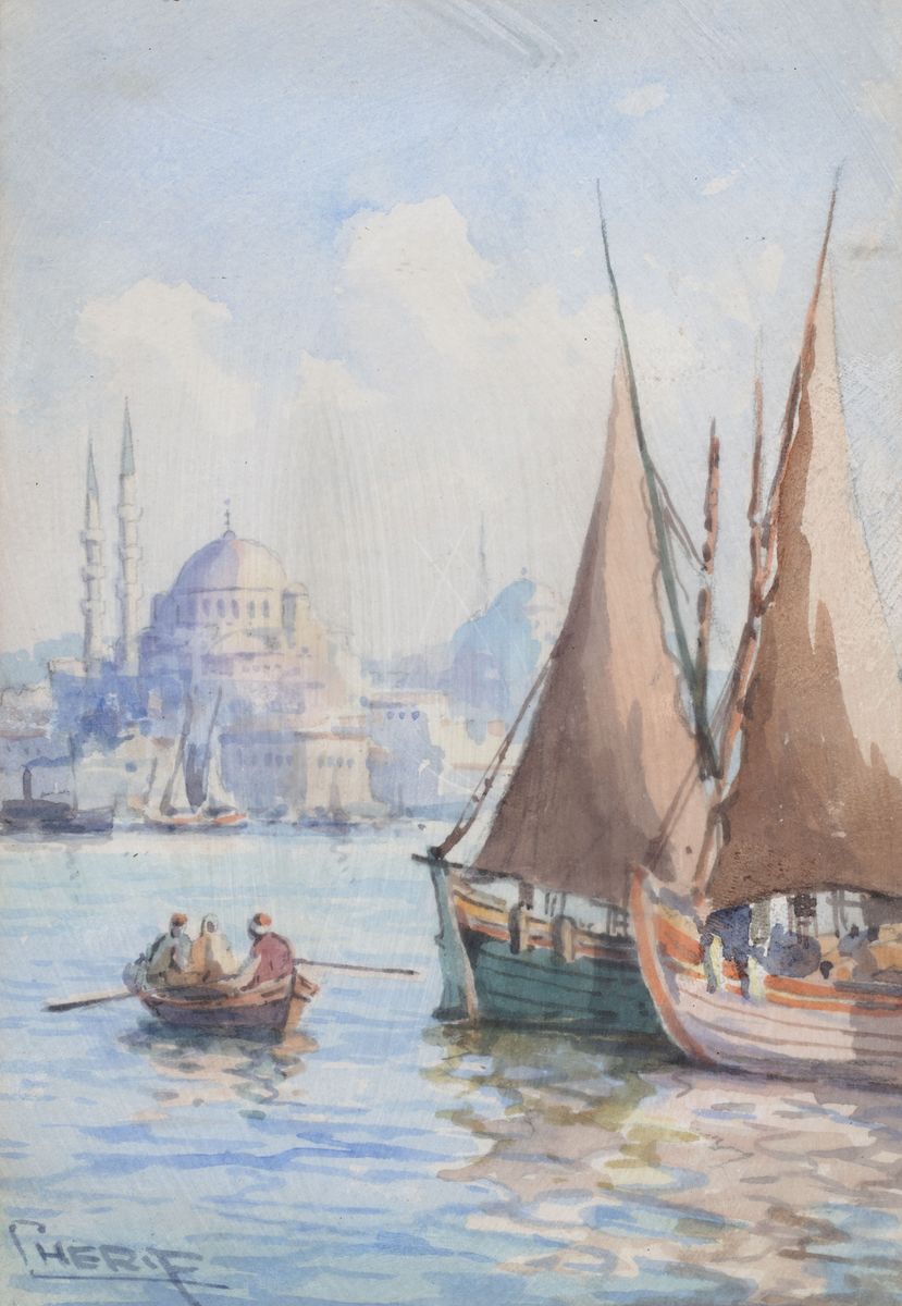 ŁODZIE ŻAGLOWE NA TLE ŚWIĄTYNI HAGIA SOFIA, pocz. XX w.