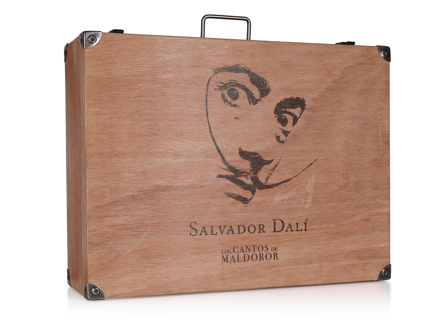 sześć zeszytów z reprodukcjami prac Salvadora Dali, 15 x 35 x 48 cm - wymiar drewnianej skrzyni.