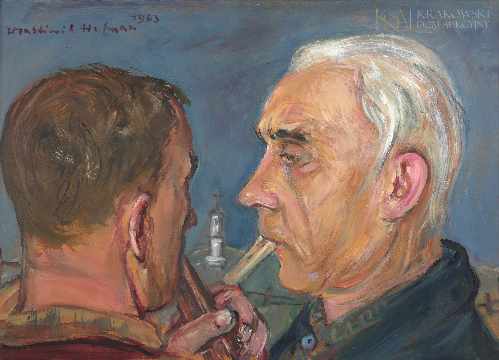 olej, płyta, 34 x 49,2 cm, sygn. i dat. l.g.: "Wlastimil Hofman 1963", Opisany na odwrocie: "Ludowi Muzykanci"