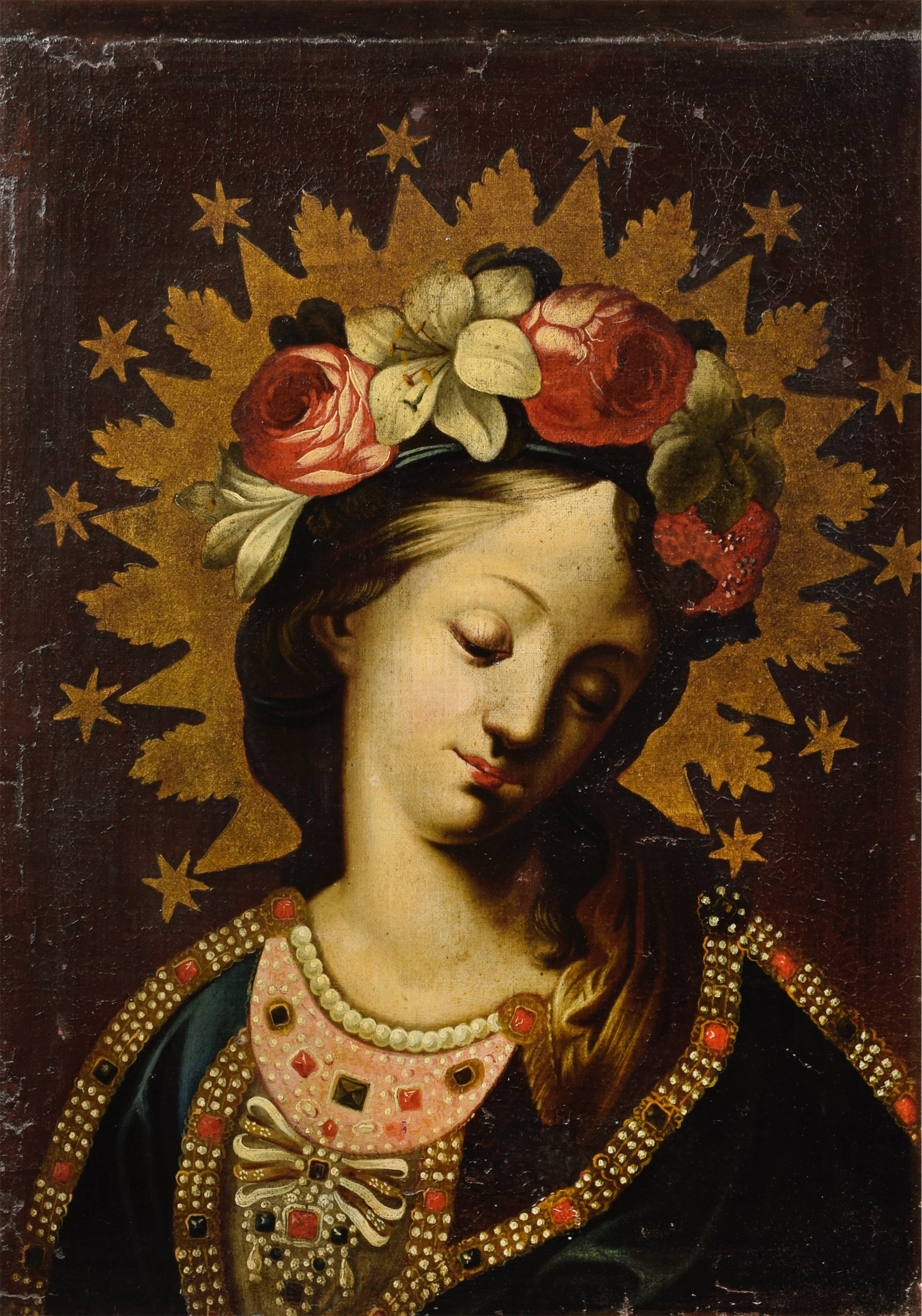 olej, płótno naklejone na tekturę; 61 x 43 cm;na odwrocie nalepka z odręcznym napisem: Madonna / der schonen / Liebe ... / .... (? - dalej napis nieczytelny).