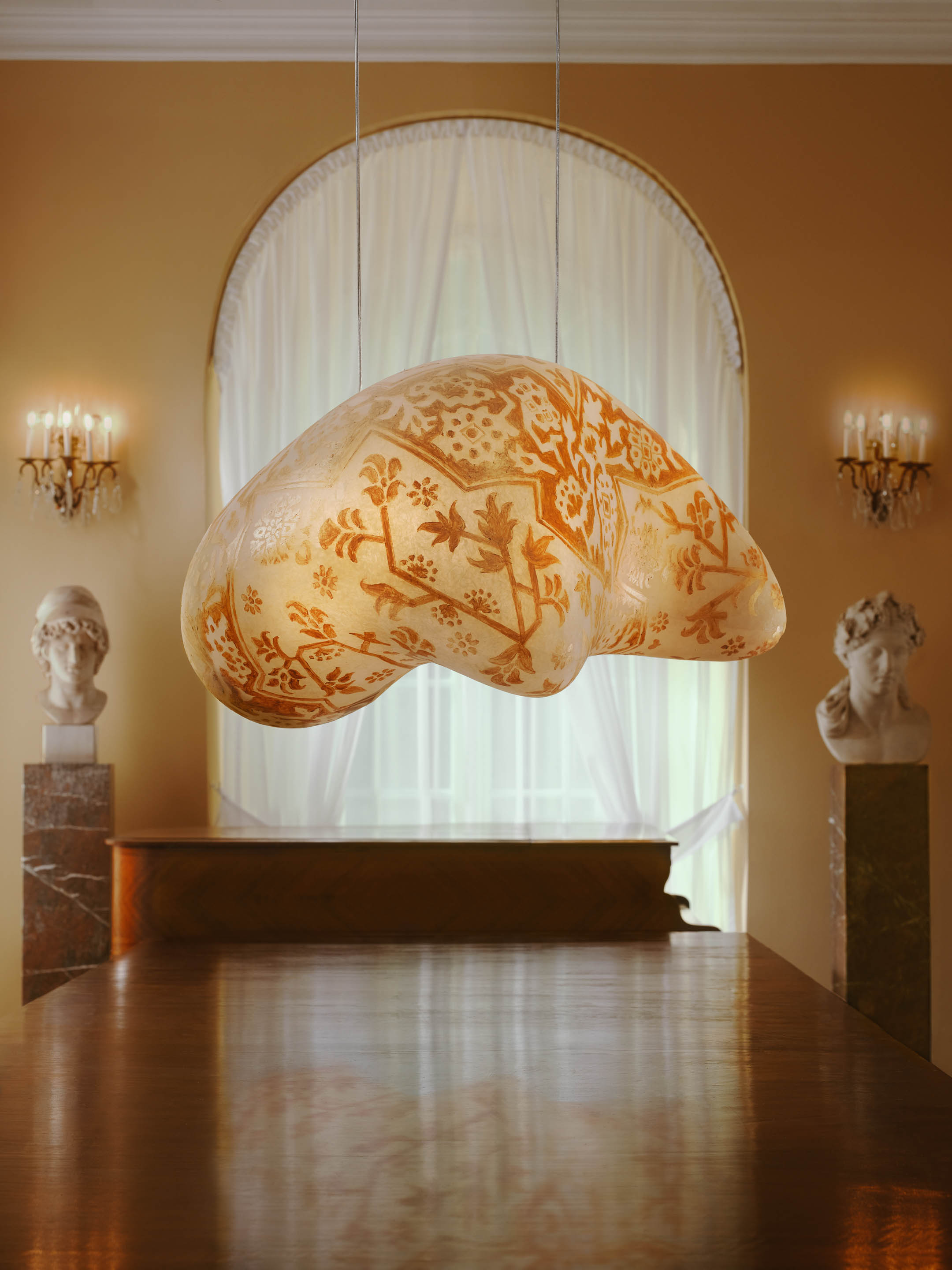 Moja wersja CLOUD, nawiązująca do wschodnich inspiracji, to Magiczna lampa Aladyna. Obiekt pokryłam malowanym złotym ornamentem z motywem rajskiego ogrodu, gdzie panowała boska harmonia i doskonałość. Motyw ten odzwierciedla ludzką tęsknotę za miejscem idealnym, w którym czujemy szczęście, pokój i piękno. Magiczna lampa Aladyna nawiązuje też do opowieści z Baśni z tysiąca i jednej nocy. Lampa ta, po potarciu, uwalnia dżina – ducha, który spełnienia życzenia właściciela. Symbolizuje ludzkie pragnienie szczęścia, realizację marzeń o bogactwie, przygodach i wolności.