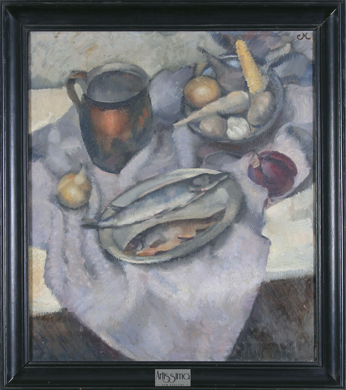 Martwa natura z rybami na owalnym talerzu, miedzianym dzbankiem oraz warzywami na białej draperii, przed 1936