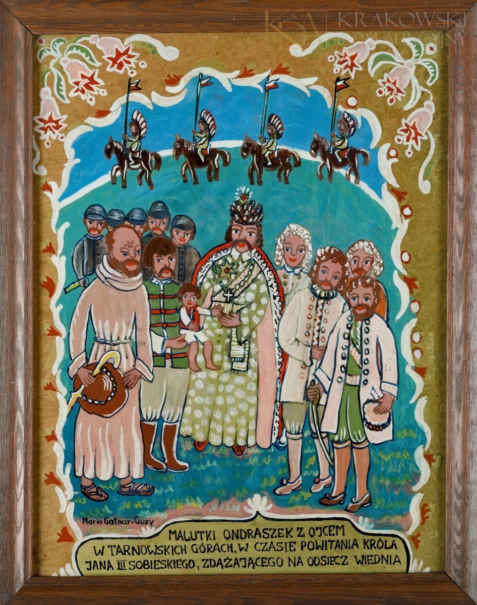 malarstwo na szkle, 43 x 32,5 cm (w świetle), sygn. l.d.: "Maria Gatnar-Guzy", opisany śr.d.: "MALUTKI ONDRASZEK Z OJCEM | W TARNOWSKICH GÓRACH, W CZASIE POWITANIA KRÓLA | JANA III SOBIESKIEGO, ZDĄŻAJĄCEGO NA ODSIECZ WIEDNIA"