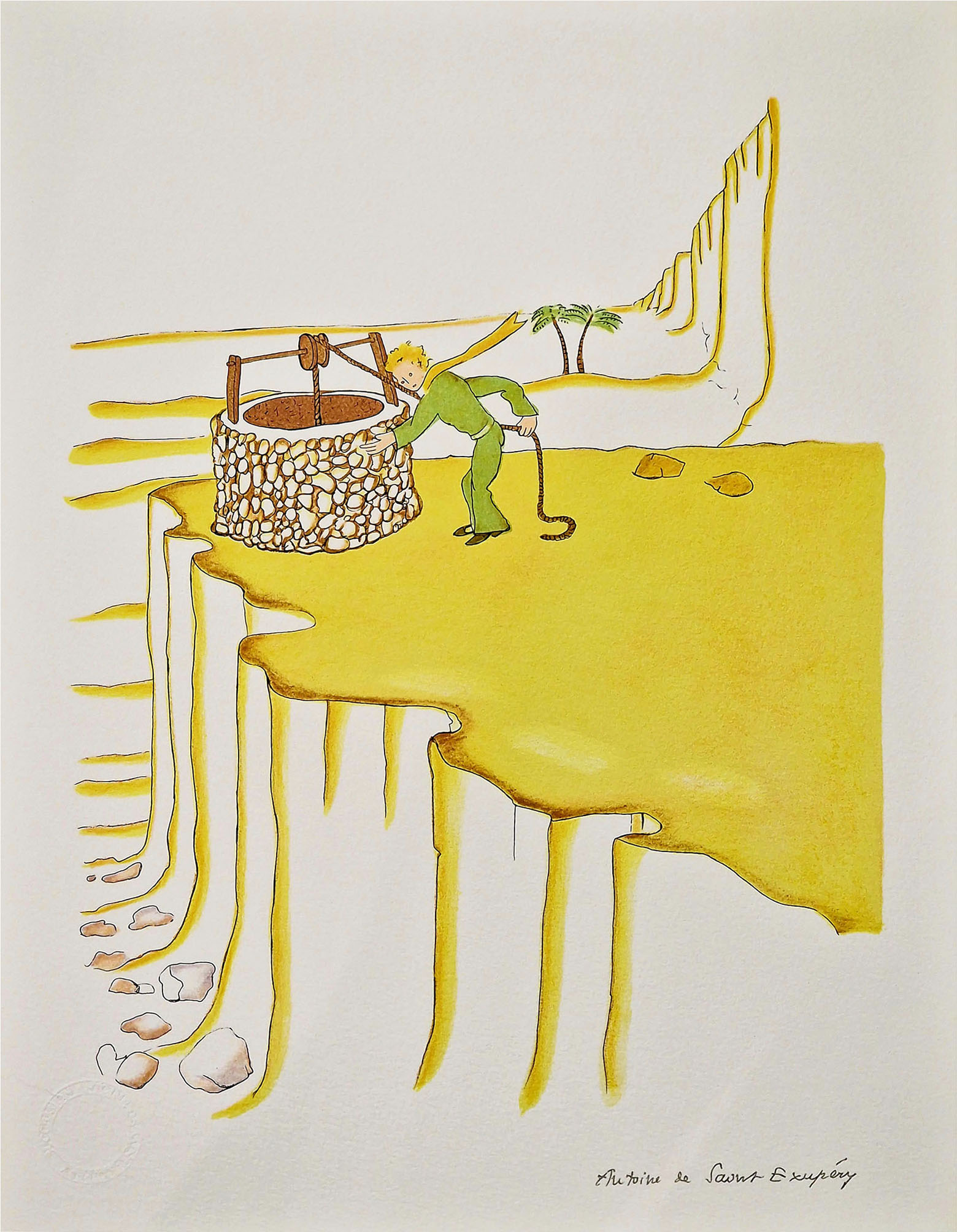 Litografia barwna, papier welinowy Arches ze znakiem wodnym ; 40 x 30 cm, faksymile podpisu autora p.d., sucha pieczęć licencyjna l.d.: „SUCCESSION ANTOINE DE SAINT-EXUPERY”.