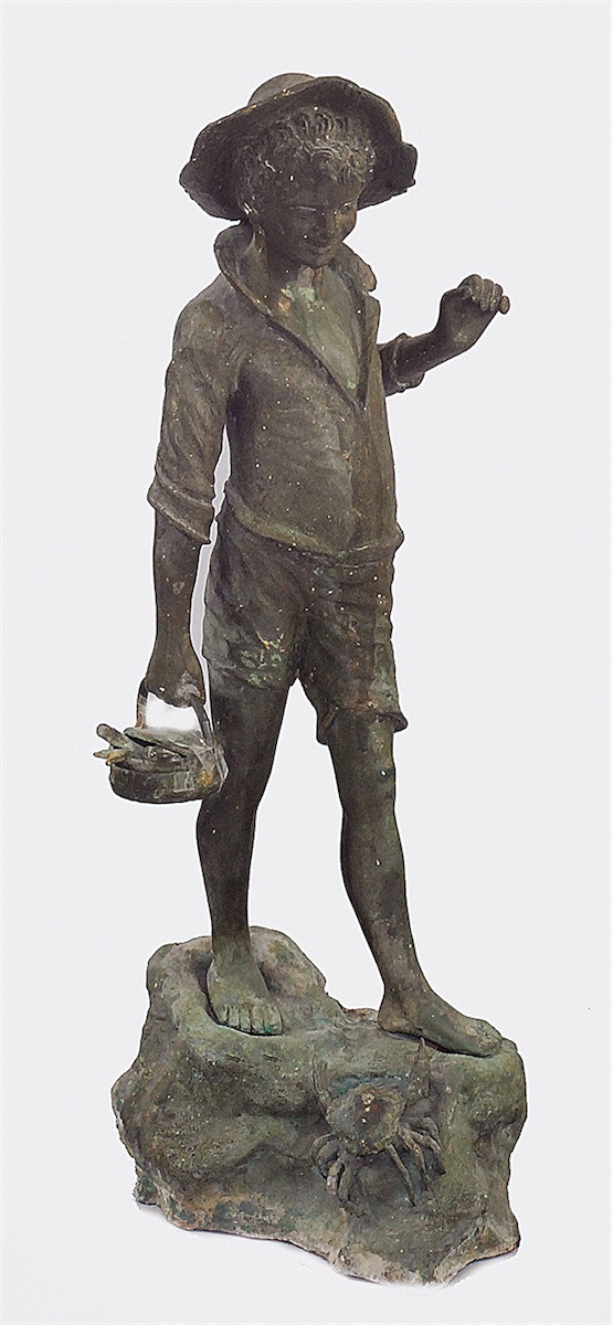 figura uśmiechniętego, bosego chłopca w krótkich spodenkach i kapeluszu z szerokim rondem, niosącego w prawej ręce koszyk z rybami, stojącego na skale, po której z boku pełznie krab; sygn. na podstawie: "G. DEMARTINO";