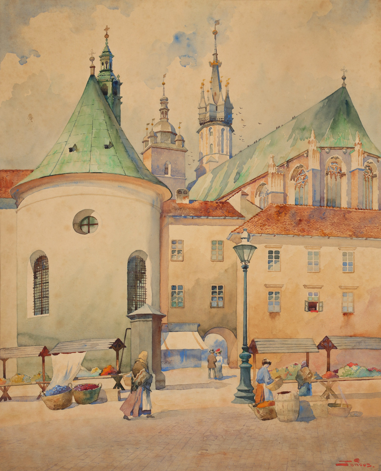 akwarela, papier naklejony na tekturę58,5 x 47,5 cm (w świetle); 89 x 77 cm (z oprawą)Sygn. p.d.: "Tondos."