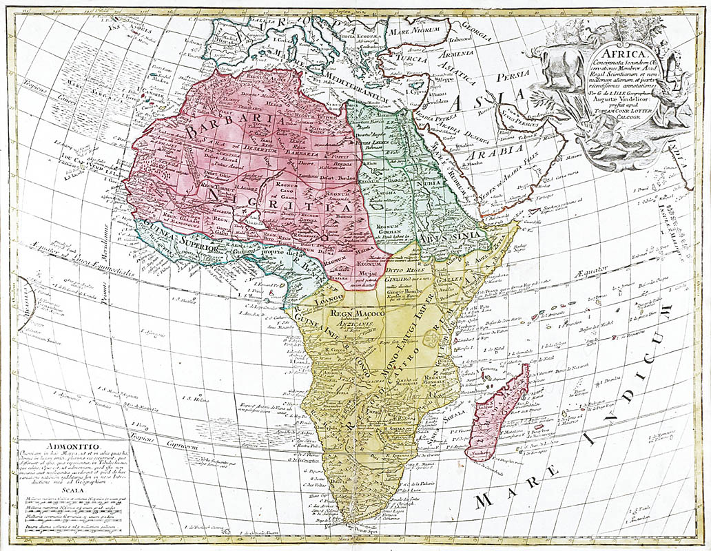 z prawej u góry, w ozdobnym, owalnym kartuszu napis: "AFRICA / Concinnata, Secundum Ob.=/servationes Membror Acad. / Regal Scientiarum et nom. / millorum aliorum et juxta / recentissimas annotationes. / Per. G. de l`ISLE Geographum / Augusta Vindelicor: / prostat apud / TOBIAM CONR. LOTTER / CALCOGR.";