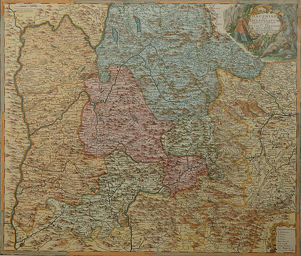 z napisem w otoczonym postaciami mitologicznymi kartuszu z prawej u góry: DAUPHINE / sive / DELPHINATUS / superior et interior / nec non / DUCATUS SABAUDIAE / pars maxima / stilo et sumptibus / TOBIAE CONRADI LOTTER /Chale. Et. Geogr. Aug. Vind.; poza płytą u dołu napis atramentem: Les Alpes de l`Ouest oraz ołówkiem: ALPY ZACHODNIE