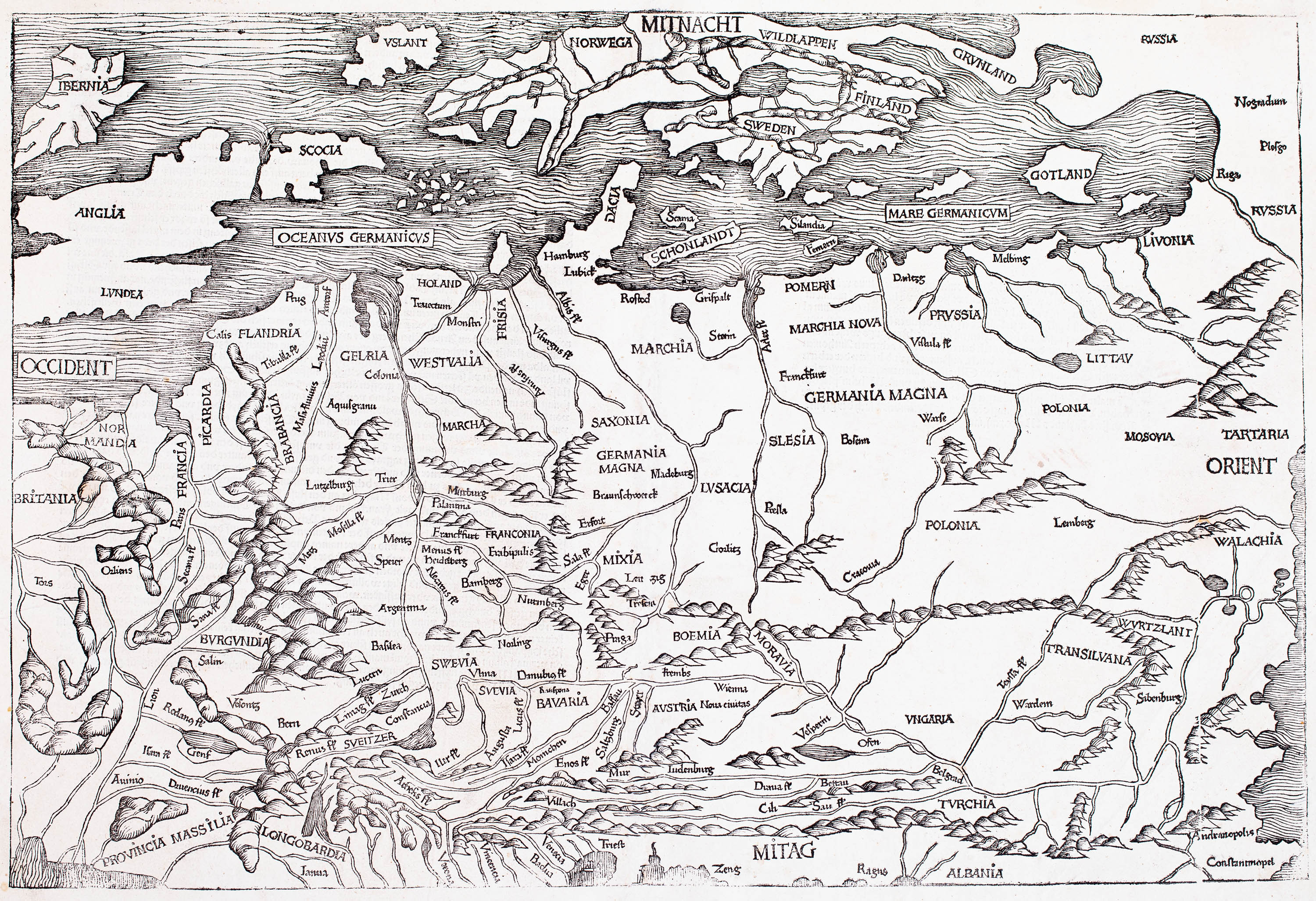 Mapa Europy środkowej, pochodząca z dzieła Hartmanna Schedla „Weltchronik“, wyd. 1493; na verso tekst w języku niemieckim drzeworyt, wym. mapy 39,5 × 58,5 cm stan zachowania bardzo dobry rzadkie