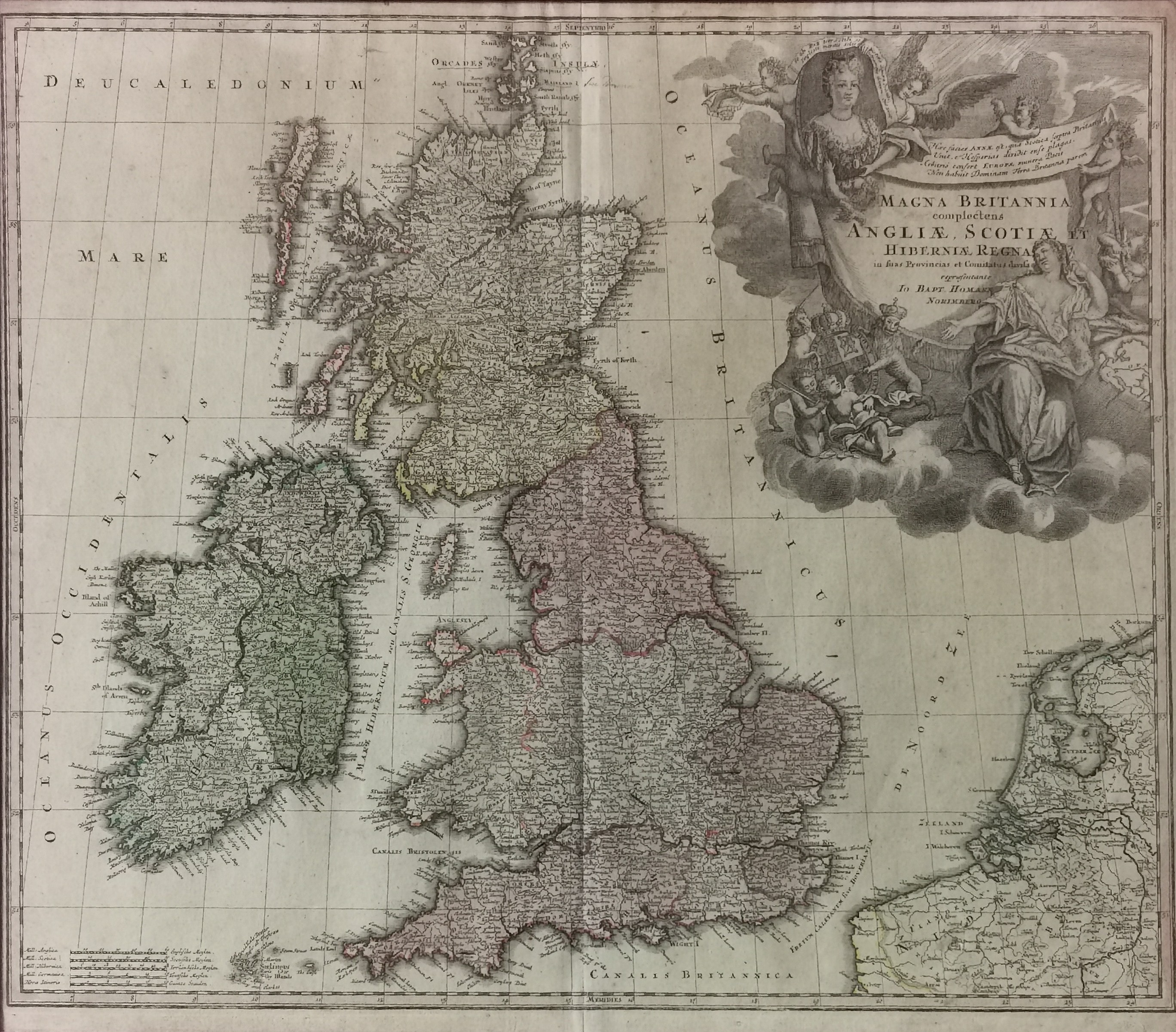 miedzioryt, papier; 50,5 x 58 cm w świetle oprawy. Norymberga, 1712 W lewym górnym narożu ozdobny kartusz z napisem: „MAGNA BRITANNIA / complectens / ANGLIAE, SCOTTIAE / et HIBERNIAE REGNA (…)”.