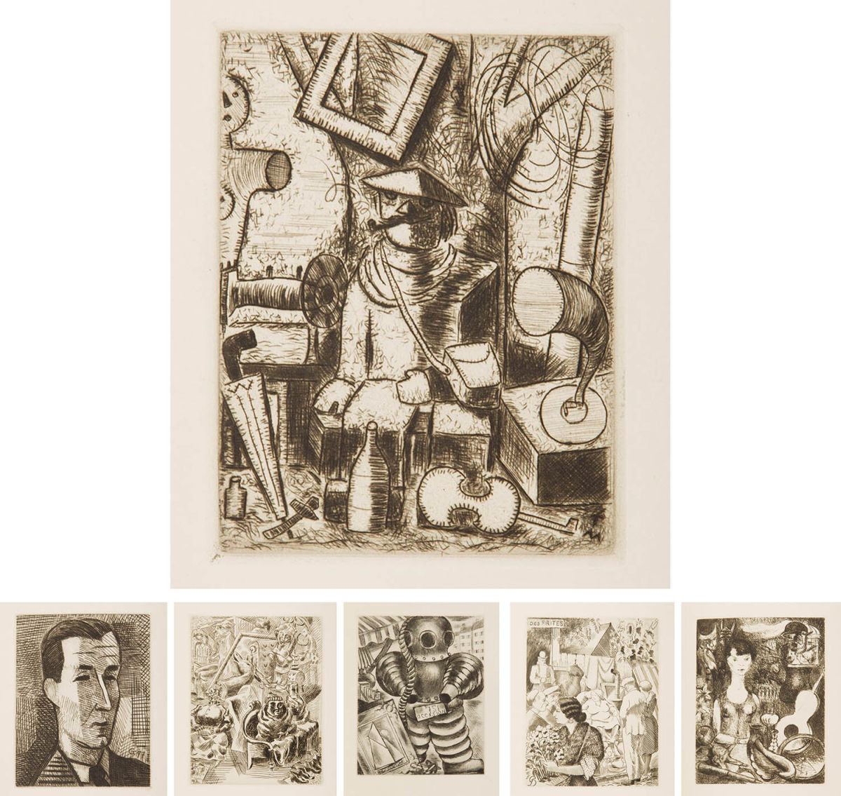 Druk bibliofilski. Poemes en prose accompagnés de 6 aux-fortes originales par Gromaire, Dubreuil, Georg, Ralli, Makowski, Per Krohg, wydany w Paryżu w 1930 roku. Edycja 171/200. Na tablicach sześć oryginalnych grafik, w tym akwaforta Tadeusza Makowskiego "Handlarz starzyzną"