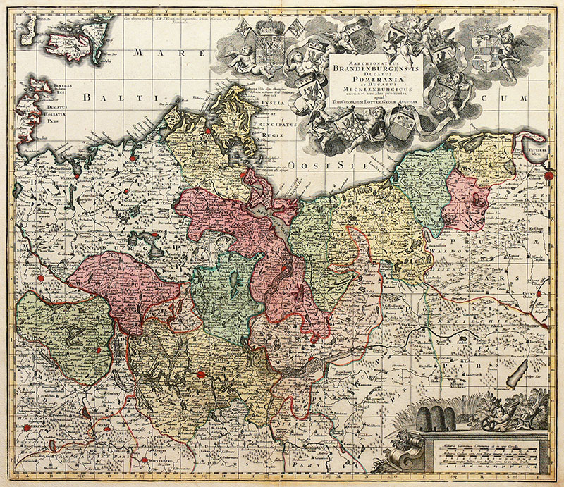 Mapa Księstwa Pomorskiego wraz z terenami przyległymi: Księstwem Meklemburskim, Marchią Brandenburską oraz znacznymi obszarami Polski, Augsburg, ok. 1760 r., miedzioryt kolorowany, 49,8 x 58,2 cm (odcisk płyty); w oprawie