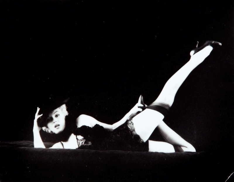 Czarno-biała fotografia Marilyn Monroe ze słynnej sesji zdjęciowej „Black Sitting” z 1956 r., wykonana w nowojorskim studio artysty.
