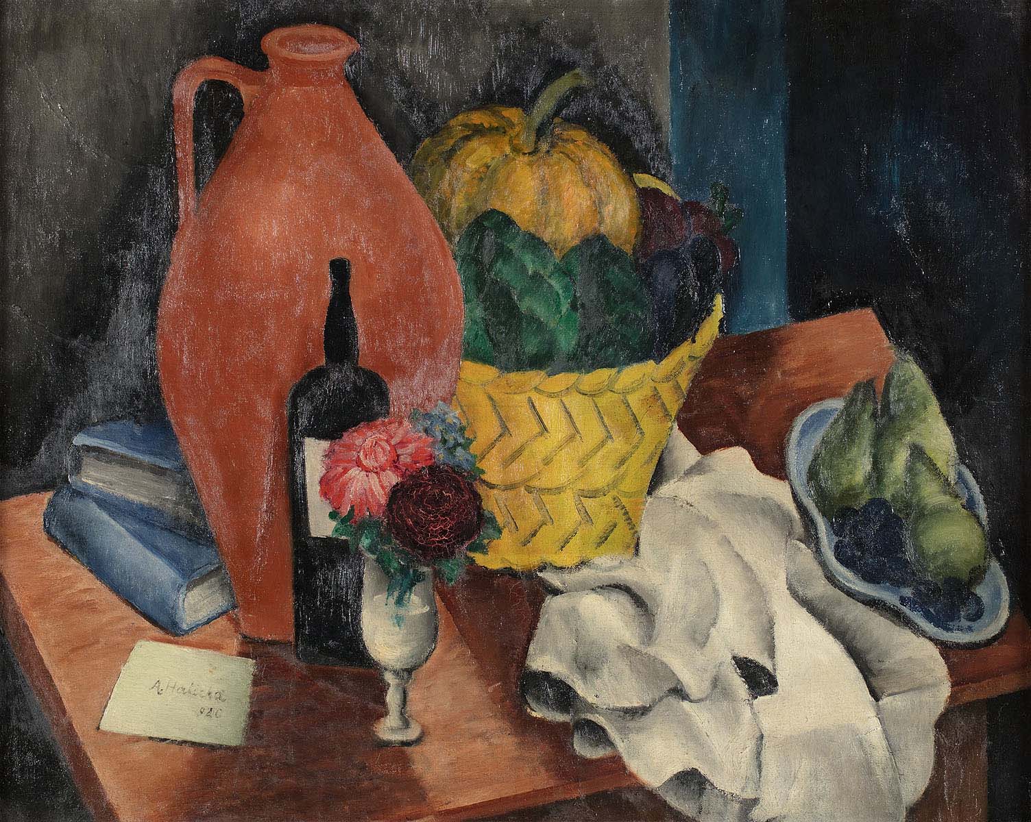 Poetycka i syntetyczna martwa natura autorstwa Alicji Halickiej charakteryzuje się potraktowaniem przestrzeni poprzez porzucenie zasad perspektywy linearnej. Przedmioty przedstawione są płasko, w dużym uproszczeniu a sam układ form i paleta sugerują świadomą prymitywizację. Oferowana martwa natura powstała w 1920 roku, kiedy w twórczości Halickiej kubizm wybrzmiewał już dalekim echem. O stosunku Halickiej do tego nurtu i tym, jak wpłynął on na dalszą jej drogę artystyczną pisał krytyk Maurice Raynal: „Z kubizmu zaczerpnęła ona nie założenia estetyczne, a dyscyplinę i praktykę twórczą. W efekcie jej kobieca wrażliwość uchroniła ją przed przyjęciem koncepcji sztuki jako czystej kreacji” (cyt. za: Tanikowski A., Alicja Halicka, w: Kolory tożsamości. Sztuka polska z amerykańskiej kolekcji Toma Podla, wyd. Muzeum Narodowe w Krakowie, Kraków 2001, s. 215). Alicja Halicka przez większość życia zmagała się z postrzeganiem jej twórczości przez pryzmat sztuki jej męża, kubisty Louissa Marcoussisa. Ucieczka od kubizmu otworzyła przed nią nowe możliwości. Oferowana martwa natura, o tonach żywych, nasyconych i dźwięcznych, to dowód na dojrzałość artystyczną Halickiej.