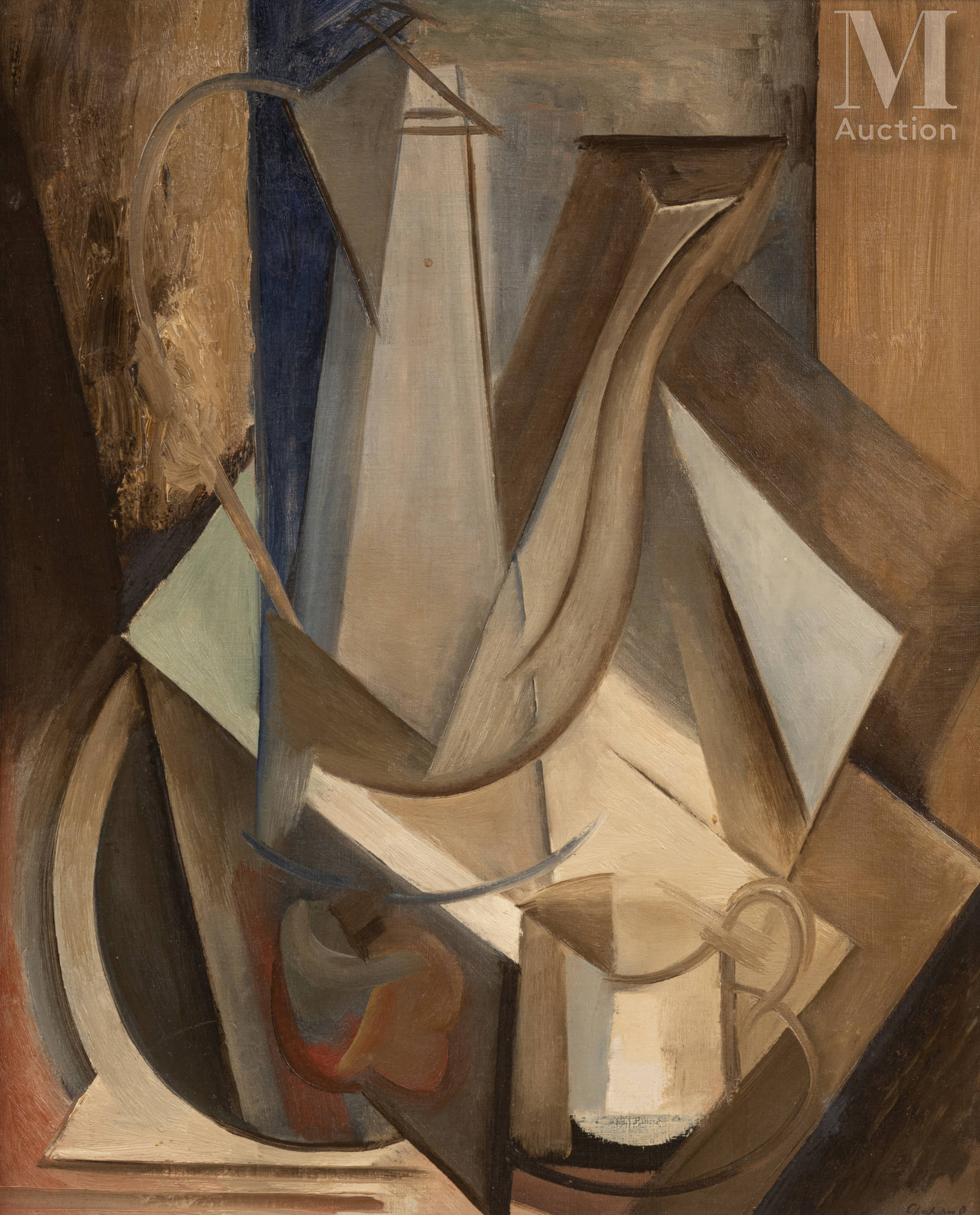 na odwrociu ramy stara etykieta wystawowa Muzeum Sztuki Nowoczesnej w Paryżu z napisem „Chapoval październik-listopad 1964 Cafetière et pommes Madame Moisesco” i numerem 13