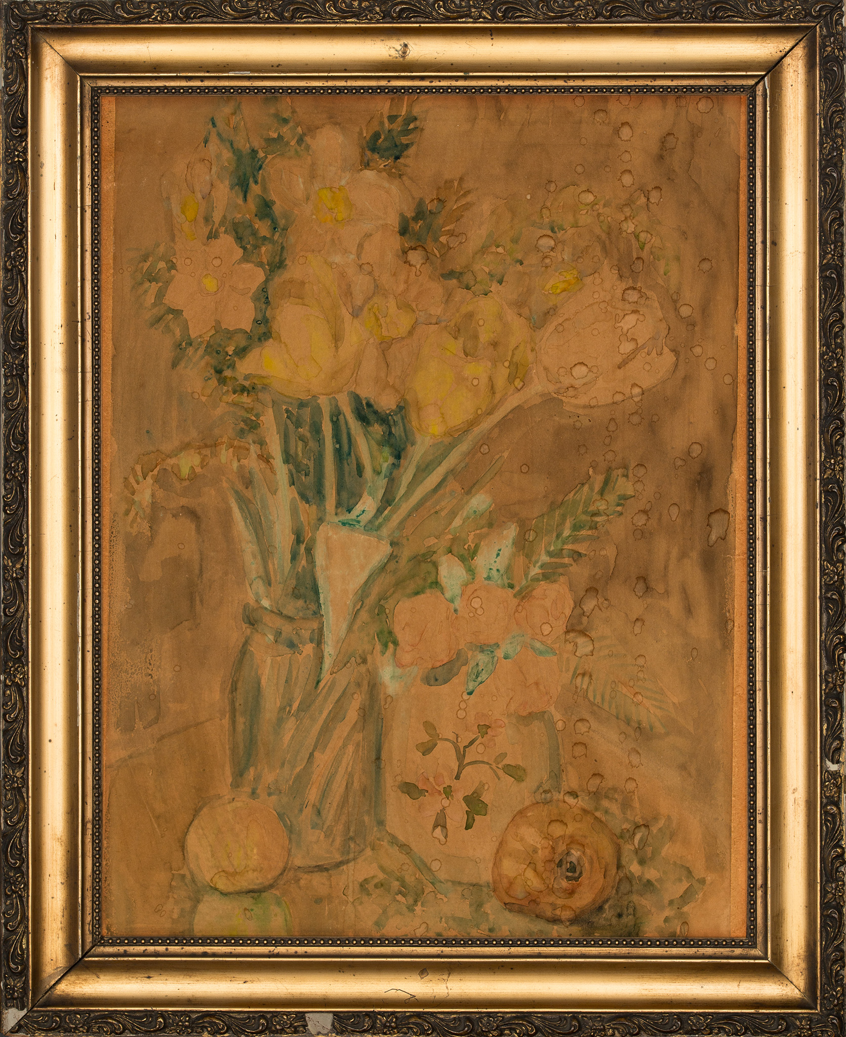 Stan zachowania: zabrudzenie i zaplamienie papieru (praca była przez lata eksponowana bez szyby).