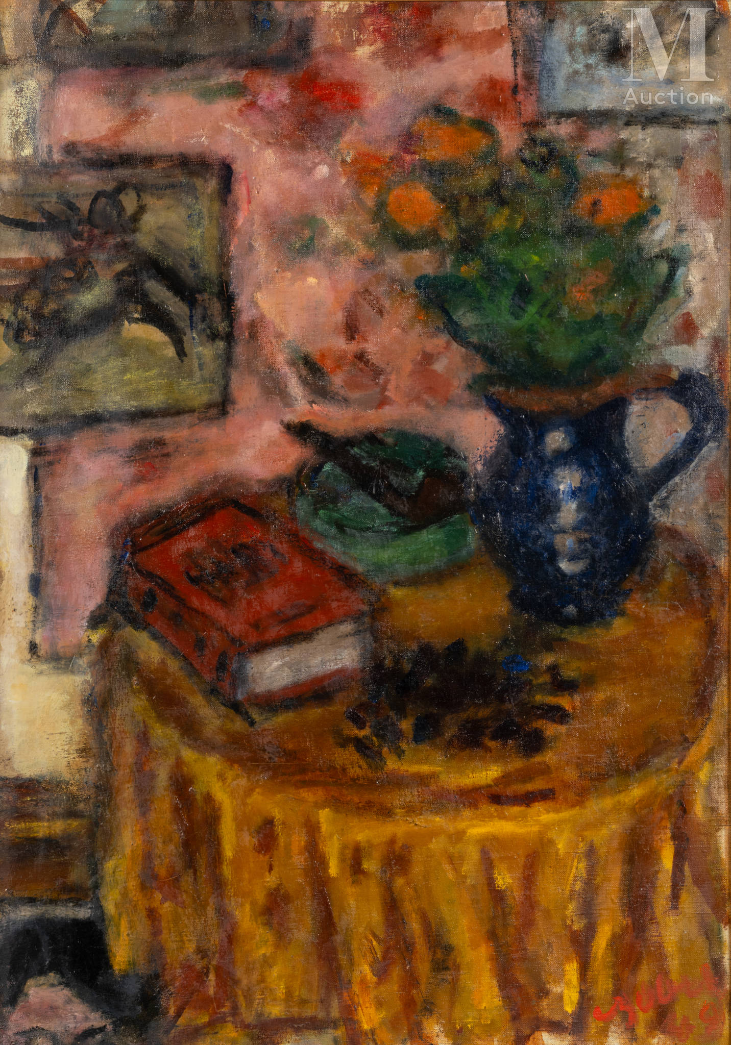 Na tym obrazie cień pomarańczowego obrusu jest przedstawiony w ciemniejszych tonach, co podkreśla fałdy i nadaje mu wrażenie wytchnienia. Stół ukazany jest z lotu ptaka, a wazon z pomarańczowymi kwiatami widziany jest z przodu, co sugeruje zerwanie z konwencjonalną perspektywą. Ogólny efekt równoważy kontrast między okrągłymi kształtami stołu i zielonej popielniczki a kwadratowymi kształtami książek, obrazu w tle i różowej zasłony.