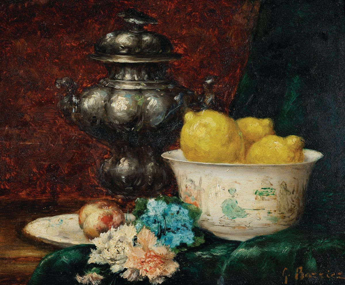 MARTWA NATURA Z GOŹDZIKAMI, CYTRYNAMI I SREBRNĄ WAZĄ