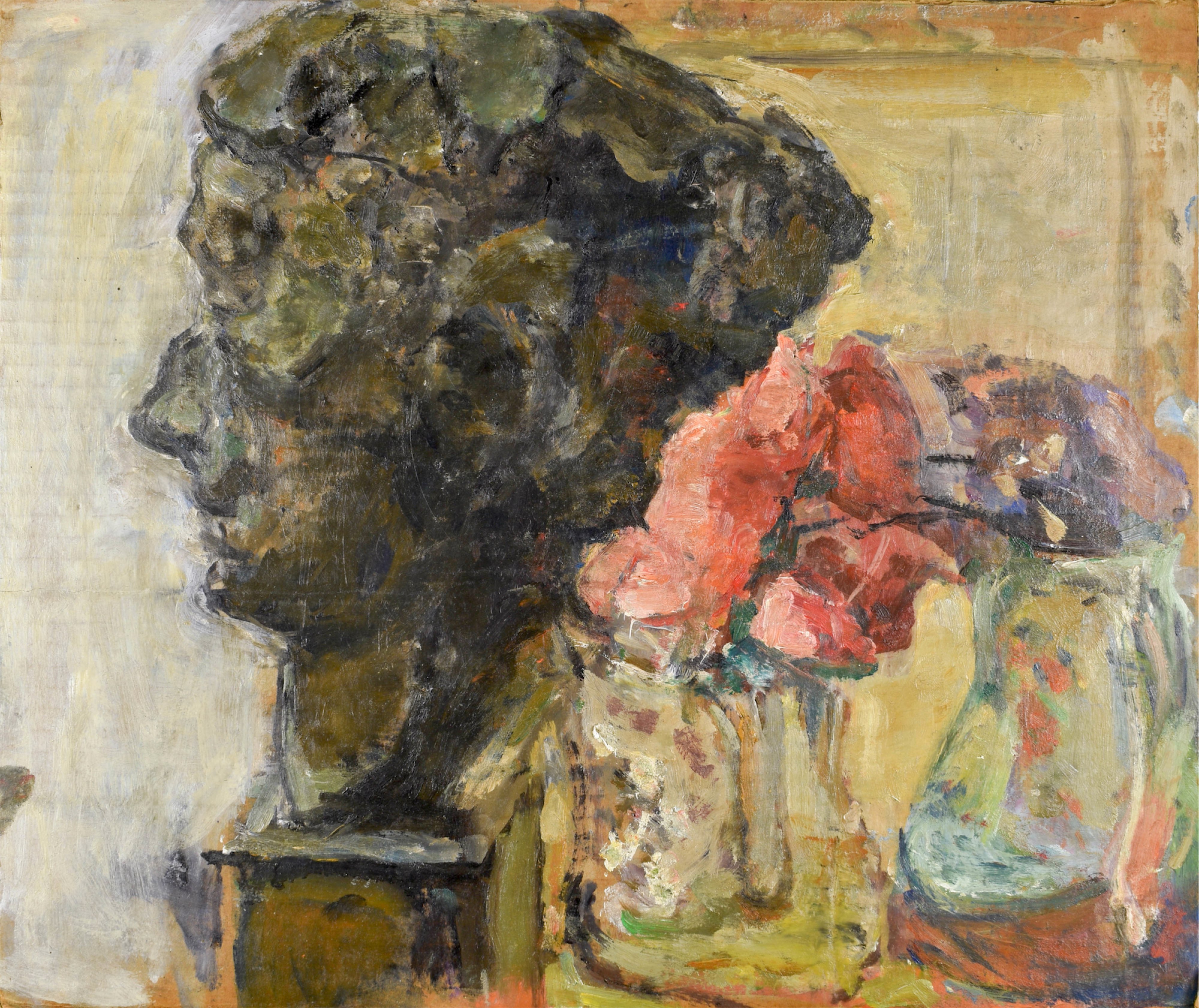 Martwa natura z kwiatami w wazonie i rzeźbą głowy
