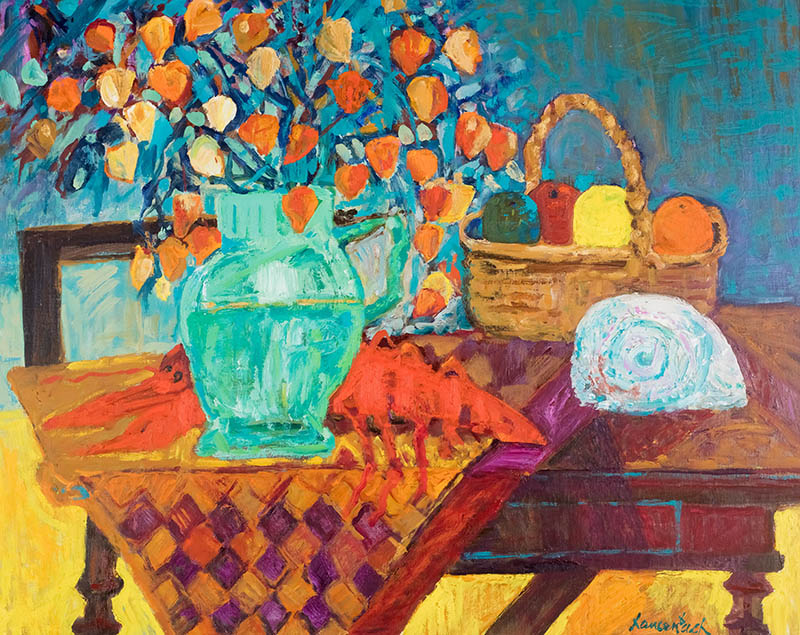 olej, płótno, 65 × 81cmsygn. p. d.: Xancenbachna odwrocie opisany: JAN SZANCENBACH/ MARTWA NATURA/Z LANGUSTĄ/ 1997