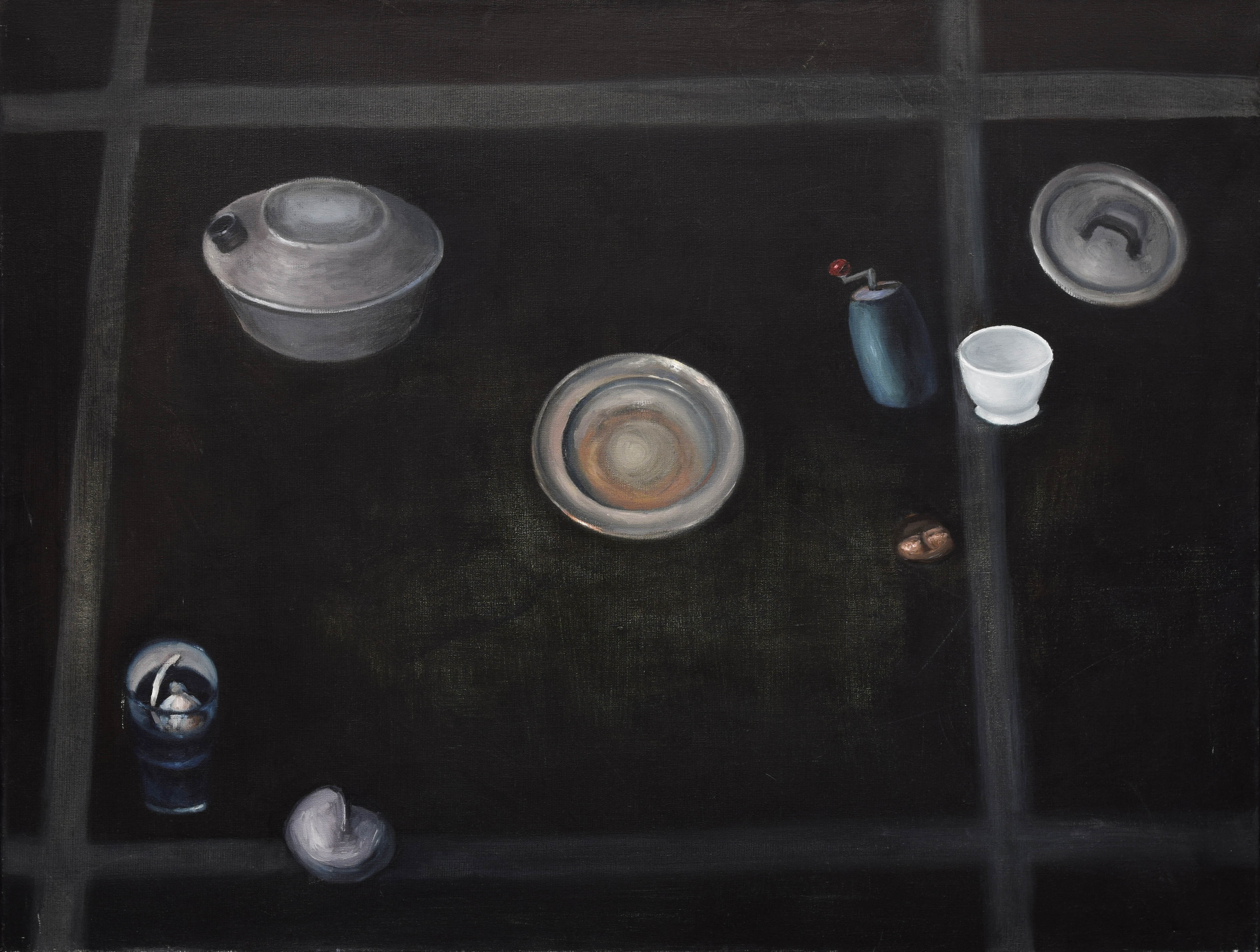 olej, płótno; 65 x 85 cm;opis autorski na odwrocie: KATARZYNA MAKIEŁA, / TAŃCZĄCY MŁYNEK, 2011, ol. pł. 65 x 85 / MARTWA NATURA Z MŁYNKIEM.