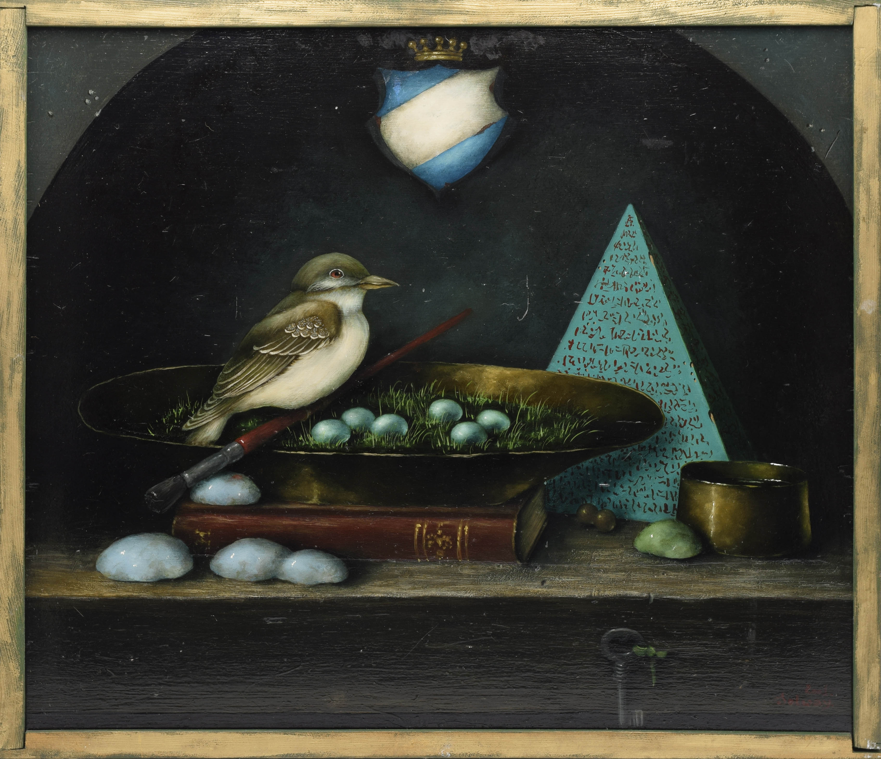 olej, deska; 49,5 x 58,5 cm;sygn. i dat. p. d.: 2001 / Solway.;na odwrocie opis autorski: 2001 R. / HANNA SOLWAY / "MARTWA NATURA Z PTASZKIEM" / OLEJ, 49,5 x 58,5 cm. / PL.