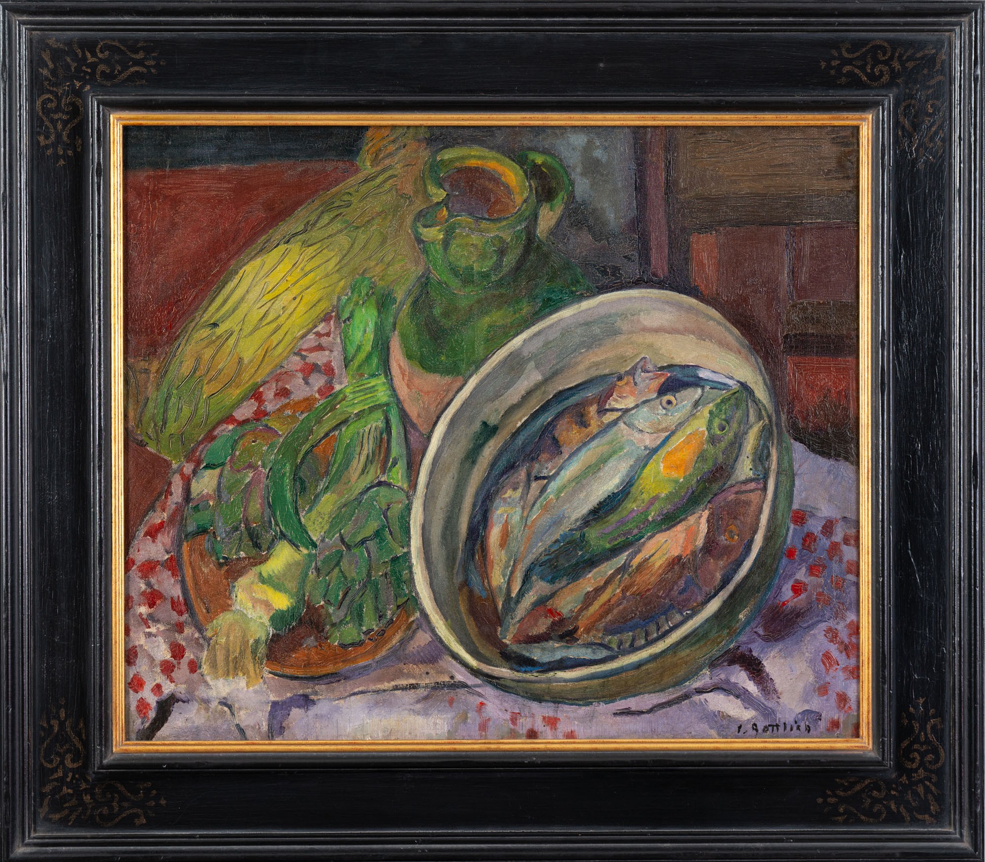 Kompozycja ukazuje Gottlieba jako dojrzałego kolorystę, dla którego martwa natura staje się polem eksperymentu z formą, światłem i barwą. Rozbudowany motyw martwej natury z rybami, czyni obraz atrakcyjnym wyborem dla kolekcjonerów poszukujących dzieł o silnym walorze malarskim i dekoracyjnym. Artysta zastosował bliskie ujęcie stołu, niemal kadrujące fragment wnętrza, skupiając uwagę wyłącznie na świecie przedmiotów i ich wzajemnych relacjach. Niemniej ważna jest warstwa kolorystyczna dzieła: zestawienie intensywnych zieleni, żółcieni i fioletów z ciepłymi brązami tła, wzmacnia dekoracyjny charakter motywu. W tej pracy widoczne są najważniejsze cechy malarstwa Gottlieba: śmiałe operowanie kolorem, dążenie do syntetycznego ujęcia formy oraz napięcie między obserwacją natury a jej przetworzeniem malarskim.