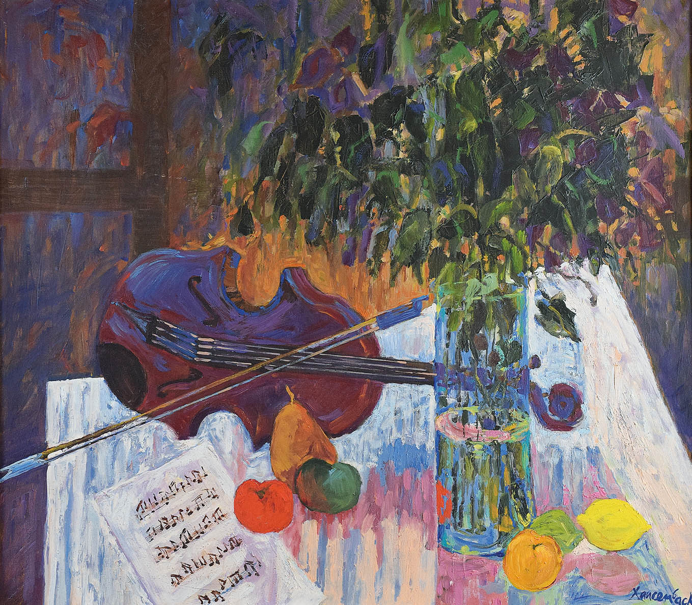 olej, płótno; 75 x 84,5 cm;sygn. p. d.: Szancenbach;na odwrocie opis autorski: JAN SZANCENBACH / MARTWA NATURA / ZE SKRZYPCAMI / 1997.