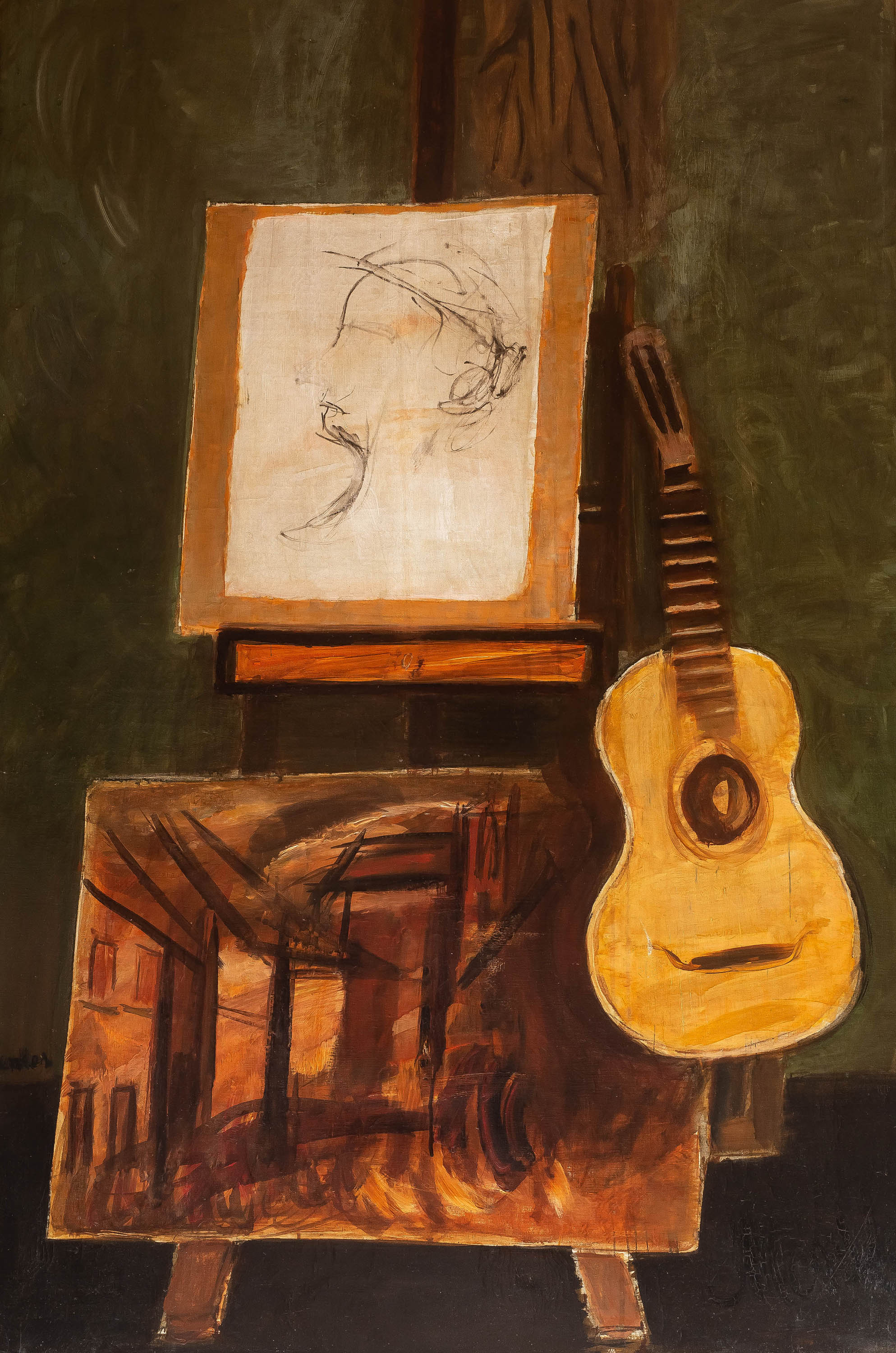 – uszkodzona nalepka paryskiej Galerie d’Art Le Portigue, Boulevard Raspail 99, z 1928 roku (z opisem): „ [...] E PORTIQUE 99, Bd Raspail a Pa [...] |Menkes |Nature morte au chevalet |Peinture |No 31”; poniżej fragment innej nalepki z odręcznym napisem: 60 p.; na krośnie napis: „PH 60P MENKES”; nieczytelna okrągła pieczęć