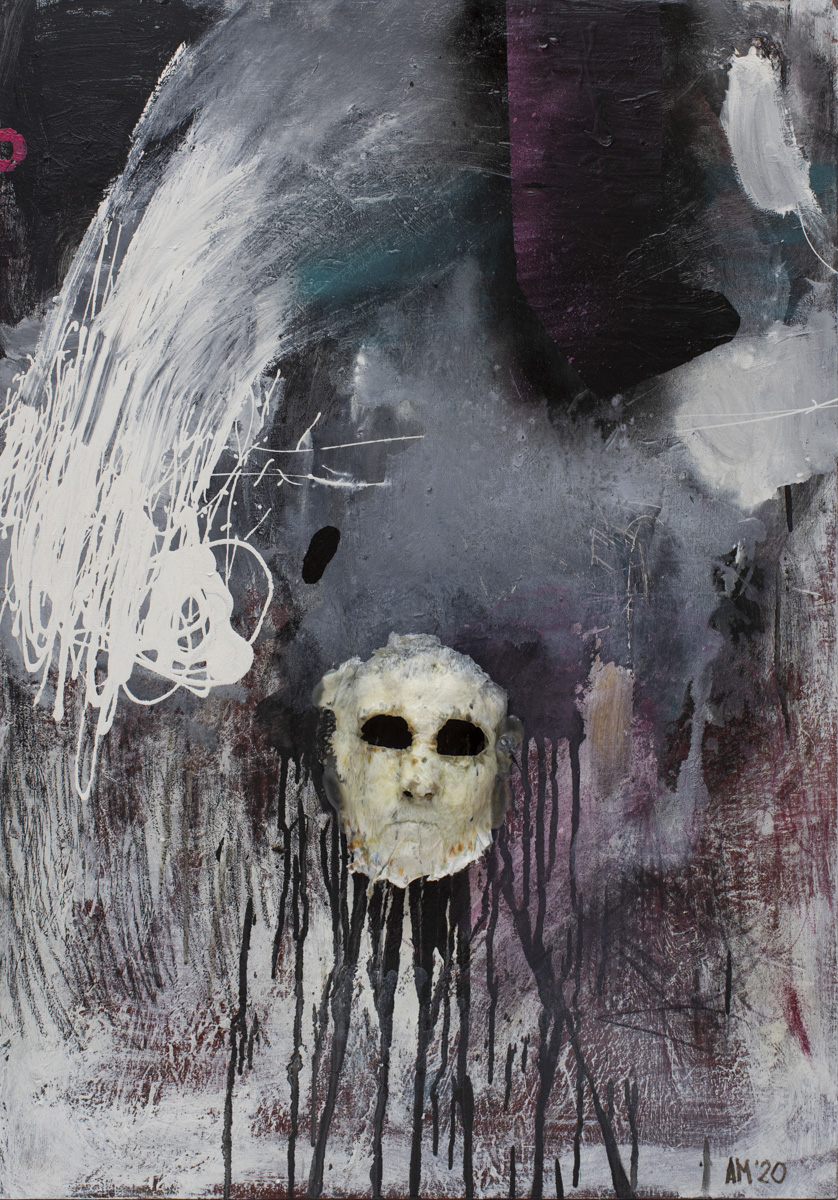 akryl, olej, węgiel, płótno, 100x70 cm,sygn. p.d.: AM '20, opisany na odwrocie: ALEKSANDRA MODZELEWSKA MASKA CZY TWARZ S103 2020