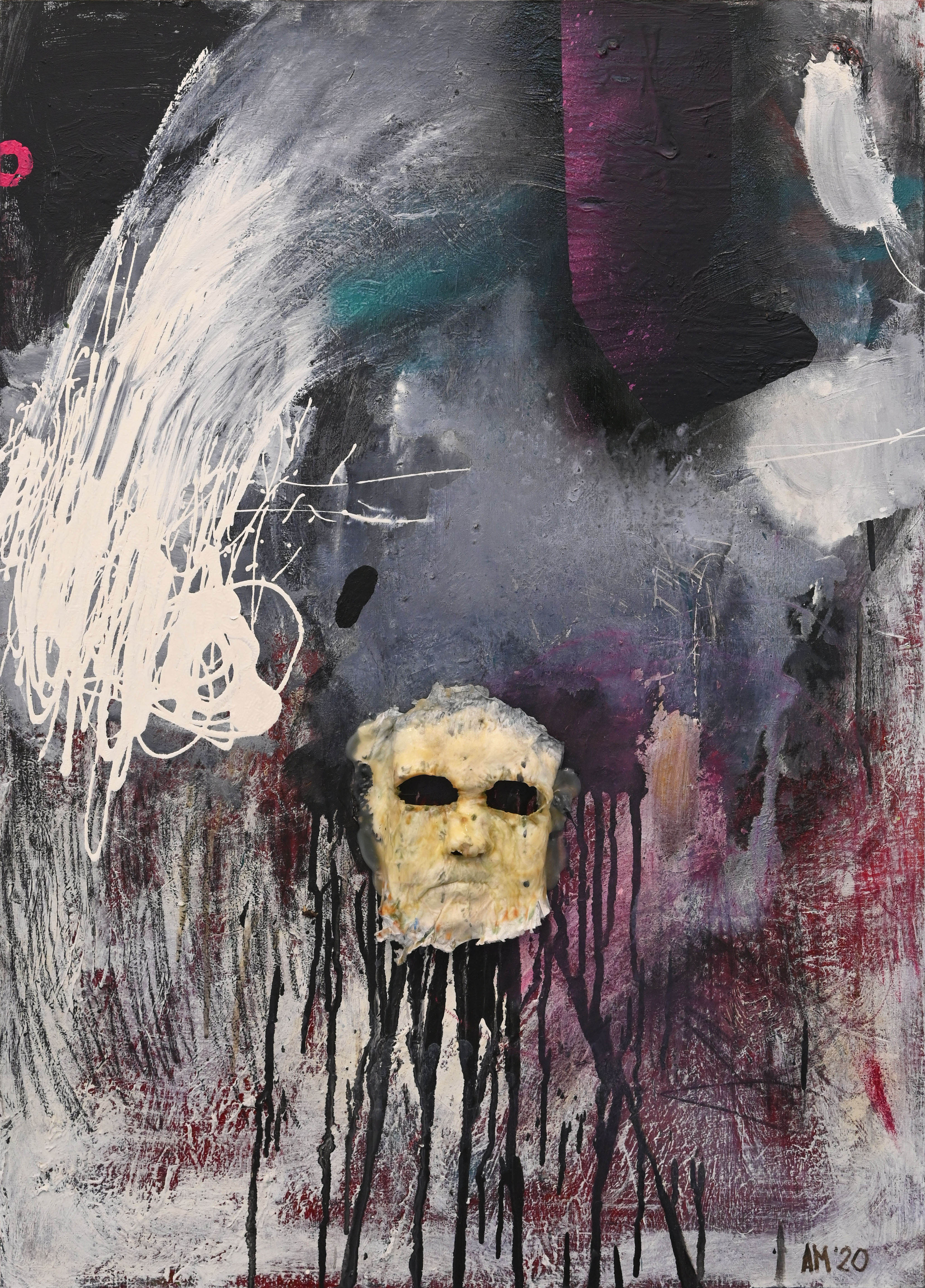 akryl, olej, węgiel, płótno100 x 70 cmsygn. p.d.: AM '20, opisany na odwrocie: ALEKSANDRA MODZELEWSKA MASKA CZY TWARZ S103 2020